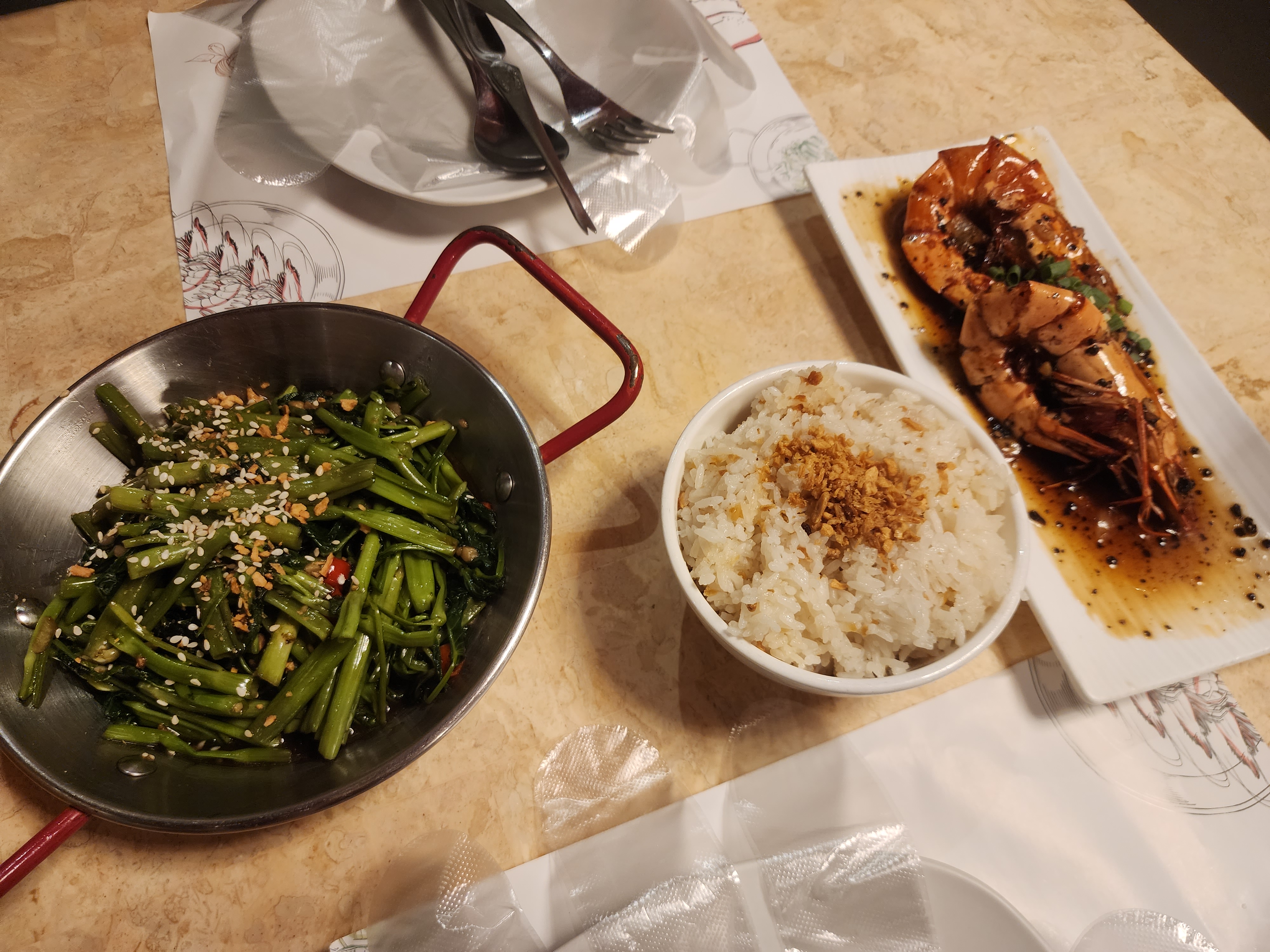저희는 칠리크랩, 모닝글로리 볶음, 갈릭밥, 산미구엘 라이트, 산미구엘 애플을 주문했습니다.