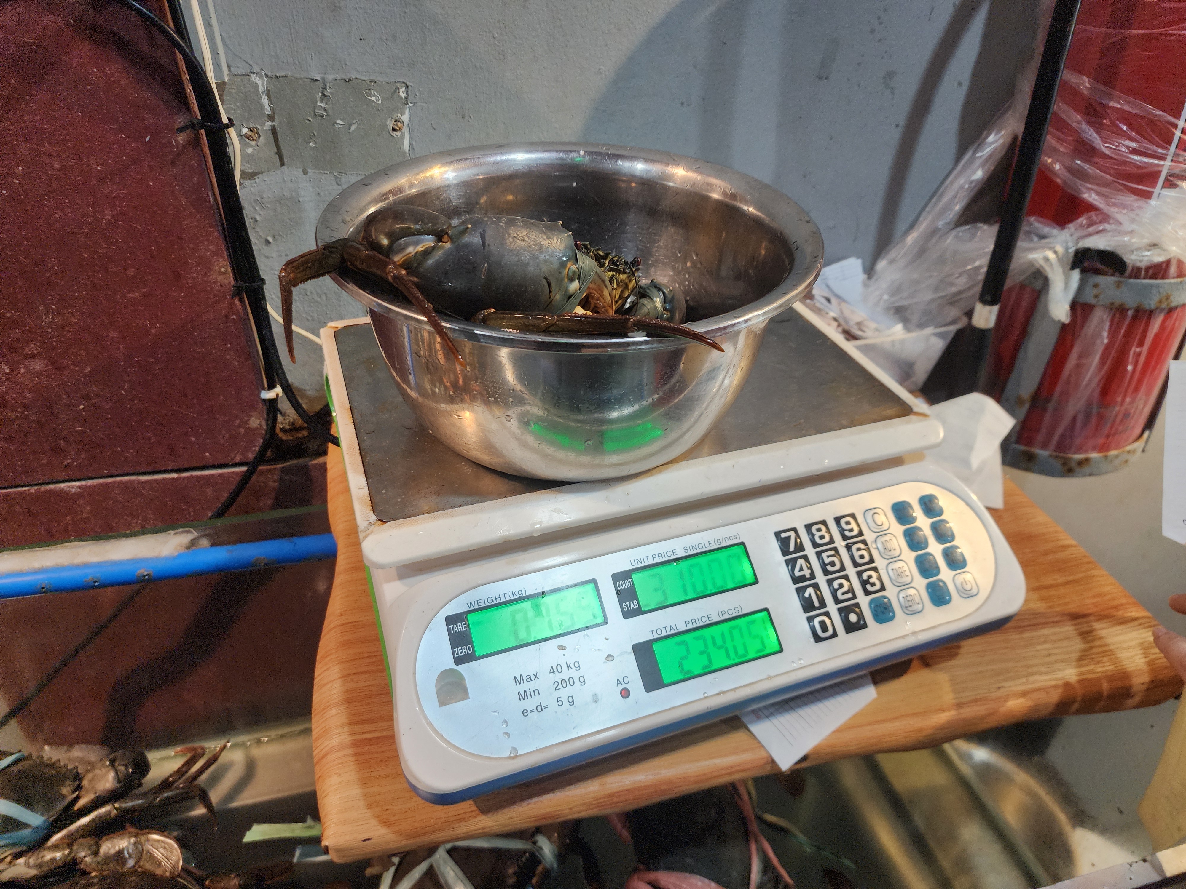 그러면 직원 분께서 스윽 보시고 크랩 한 마리 집어서 무게를 재줍니다.