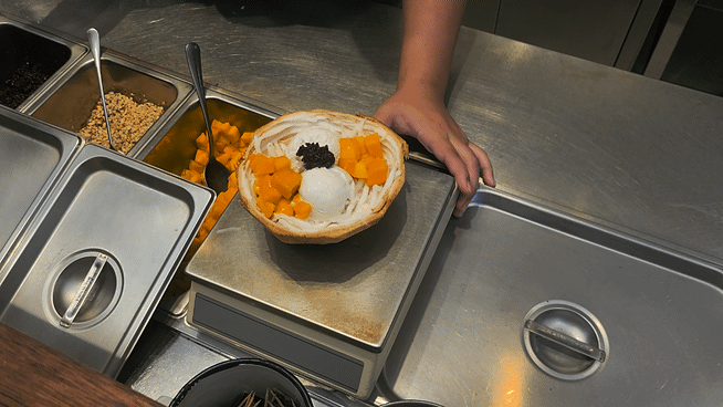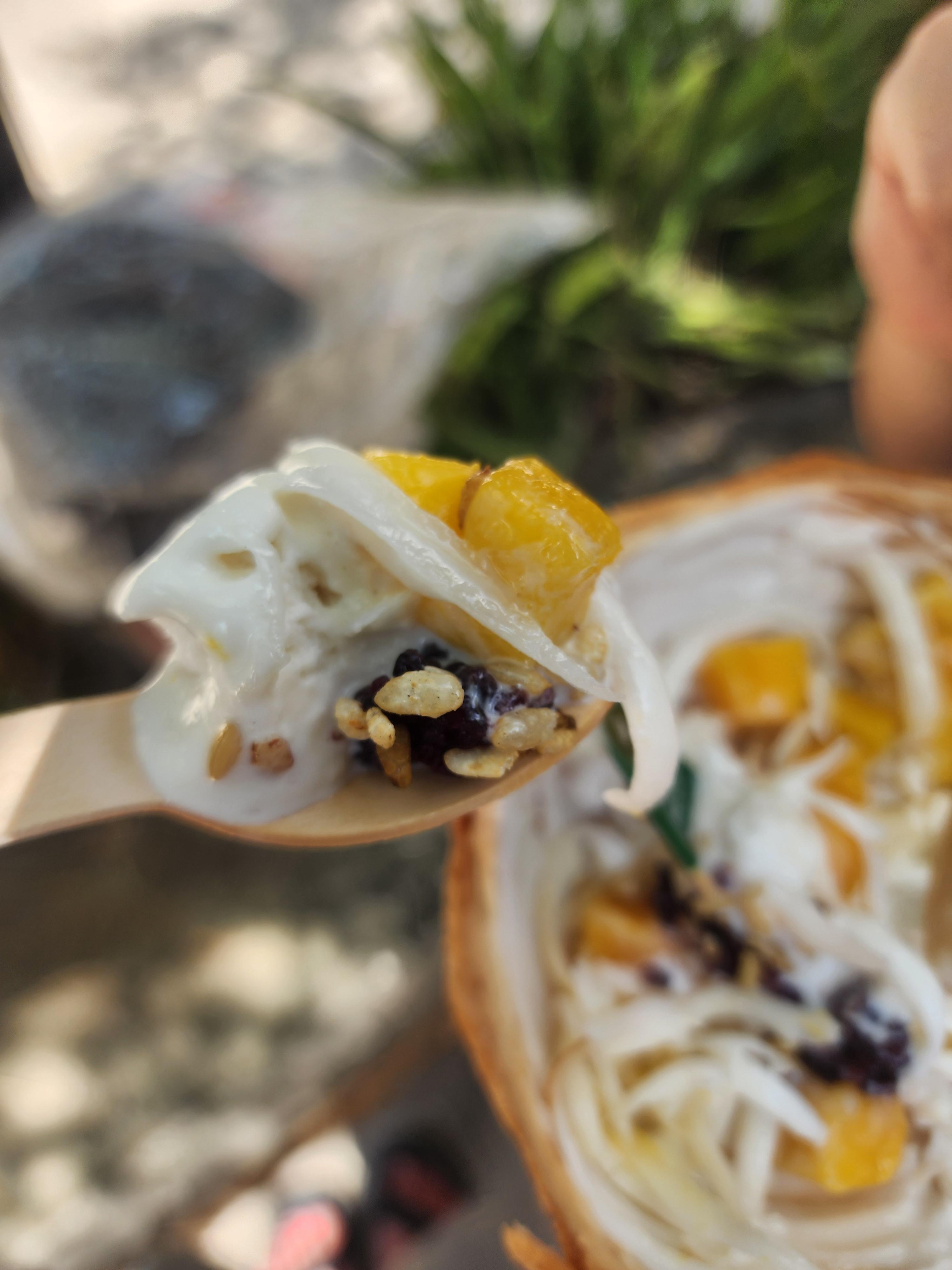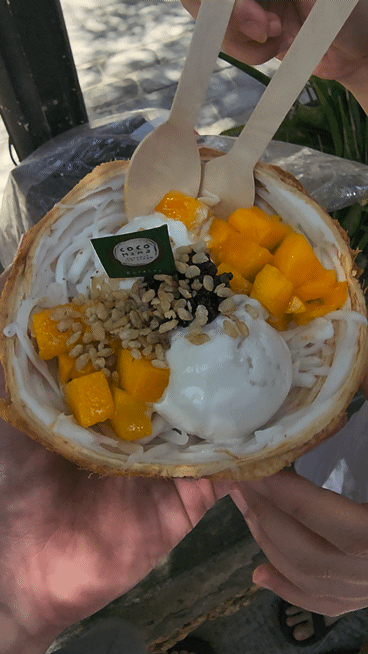 망고와 코코넛 아이스크림, 쌀 튀김, 코코넛 과육이 들어가 있습니다.