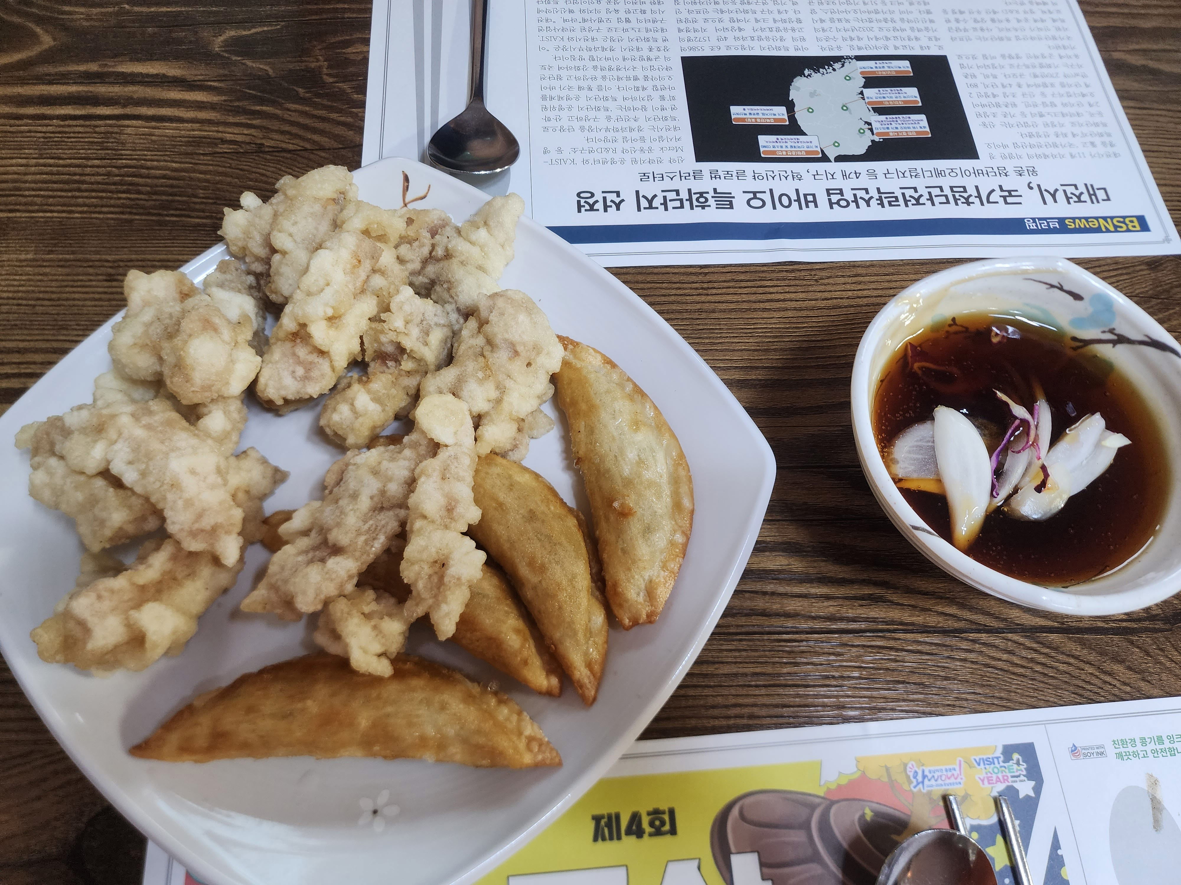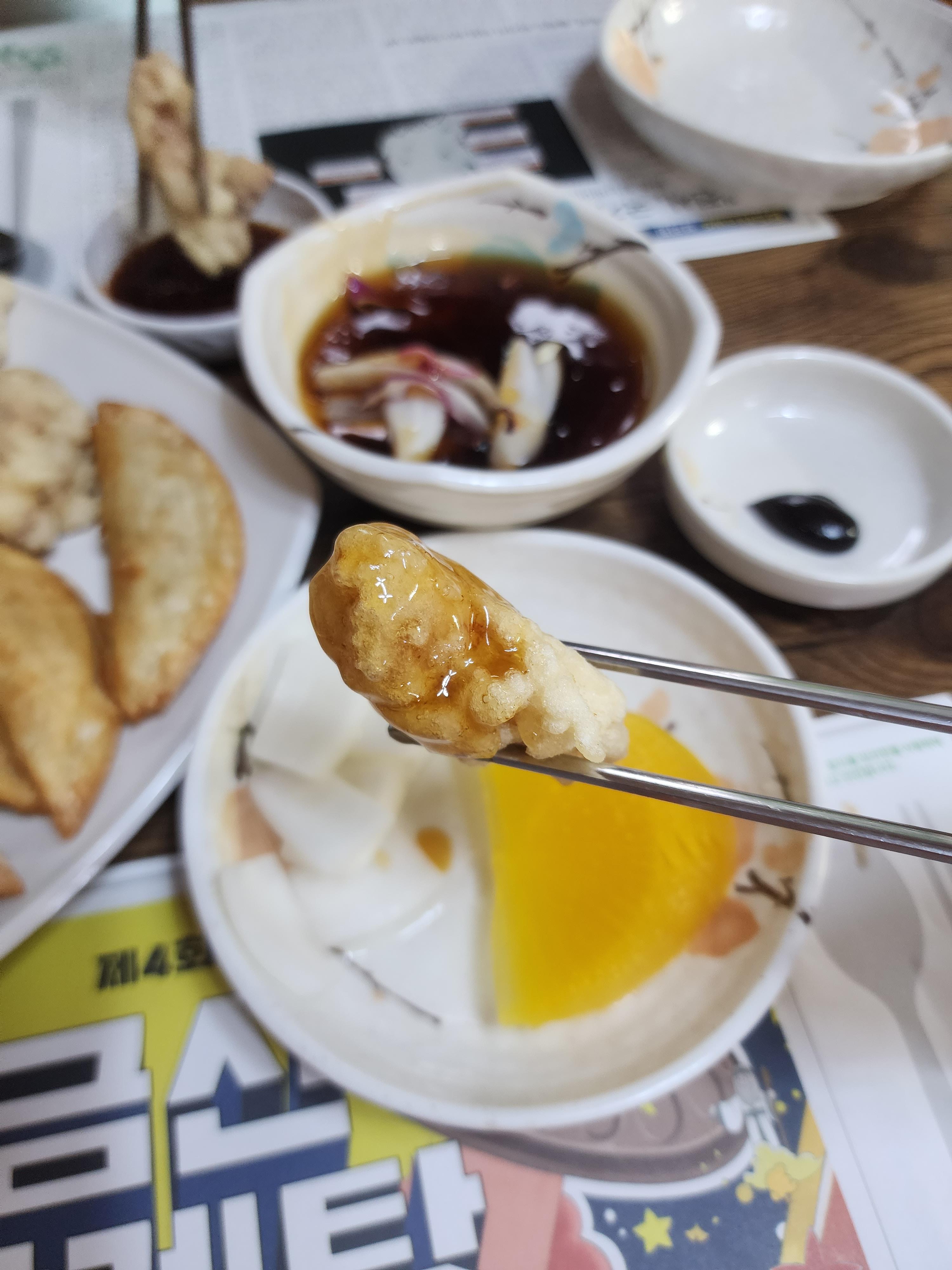 간장만 찍어도 먹어보고 탕수육 소스를 찍은 다음에 간장을 찍어서 먹기도 합니다.