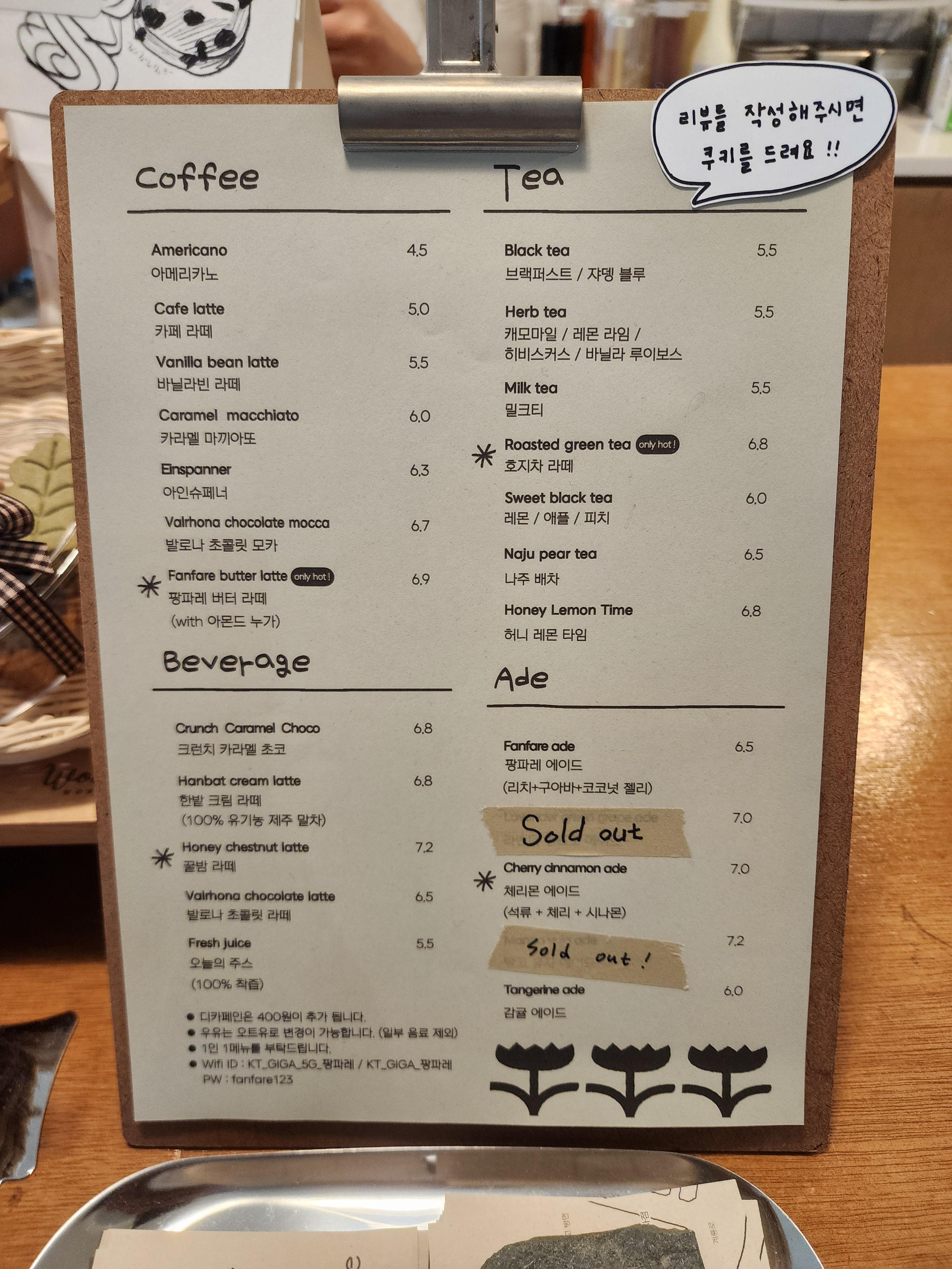 팡파레 과자점 음료 메뉴 및 가격입니다.