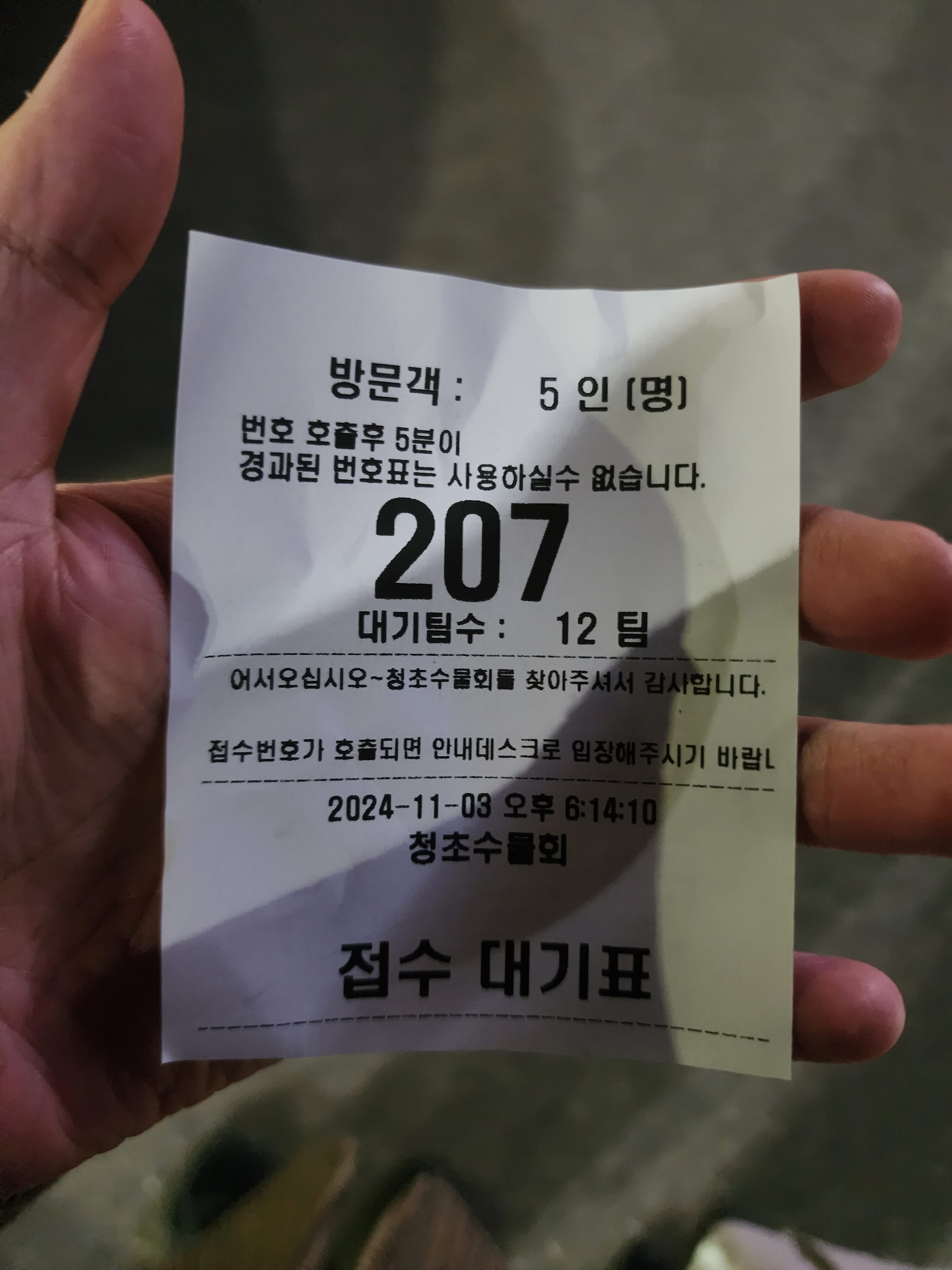 청초수물회에 오면 제일 먼저 대기번호를 뽑아야 합니다.