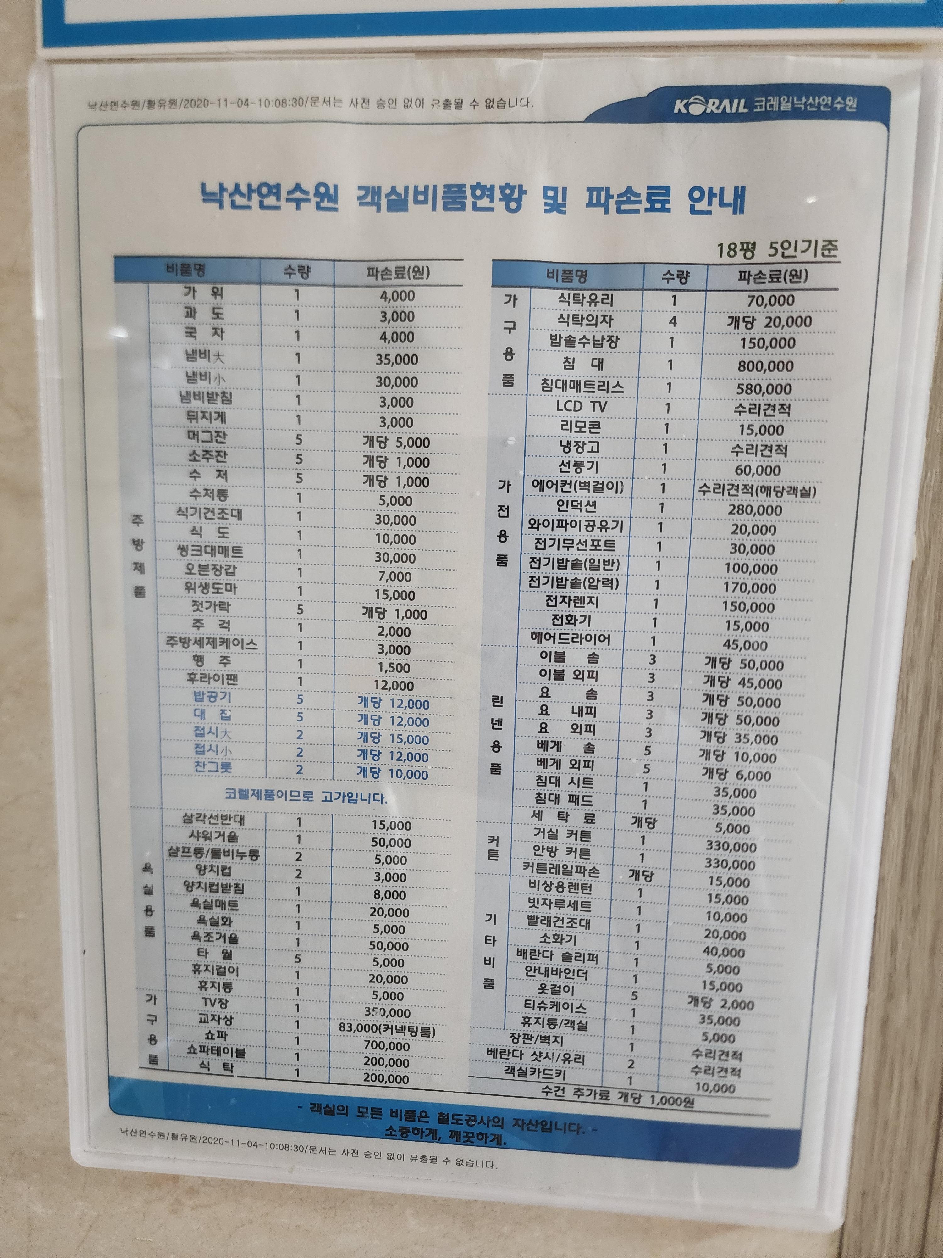 객실비품현황 및 파손료 안내문입니다.
