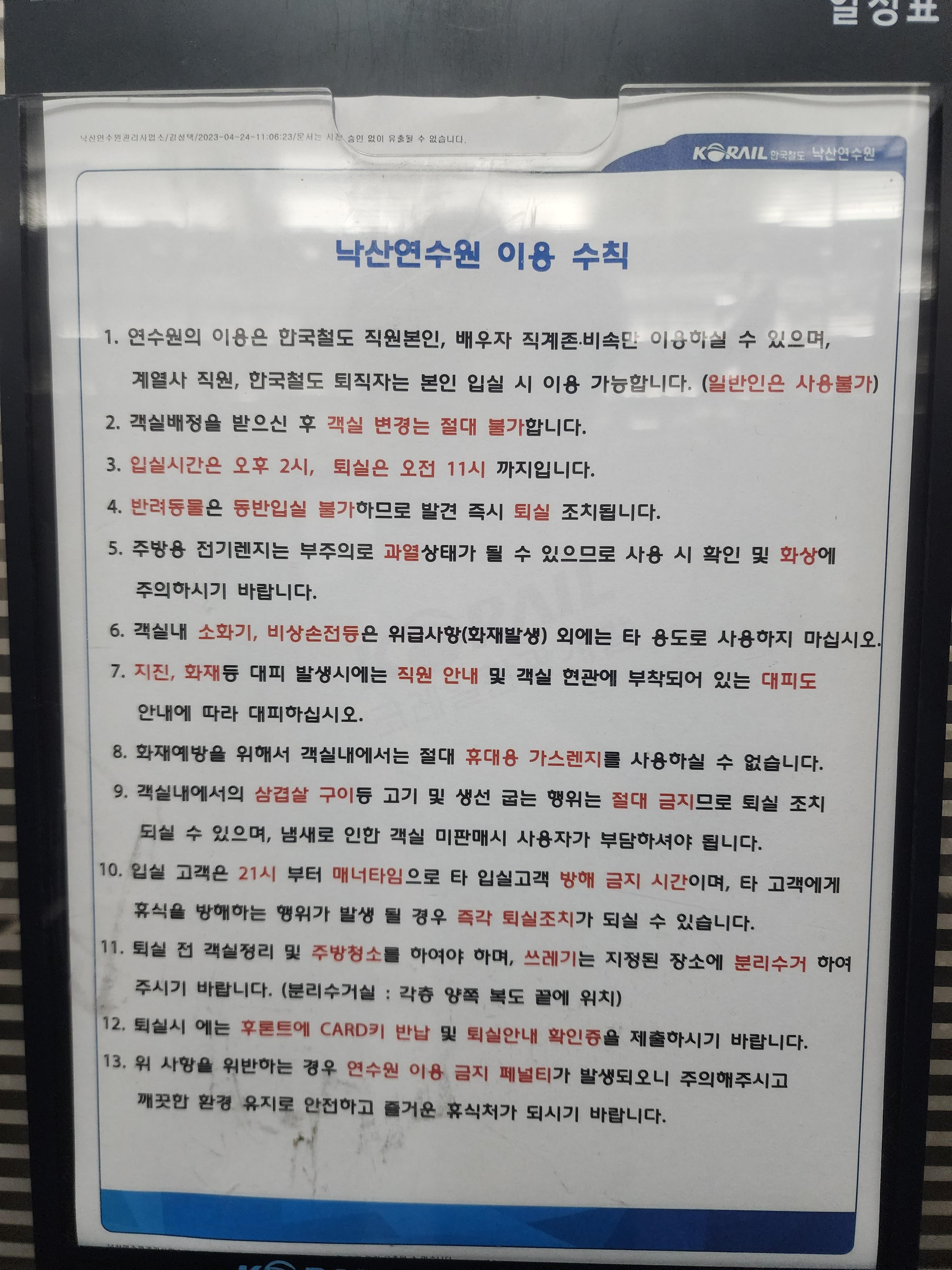 코레일 낙산연수원 이용 수칙입니다.