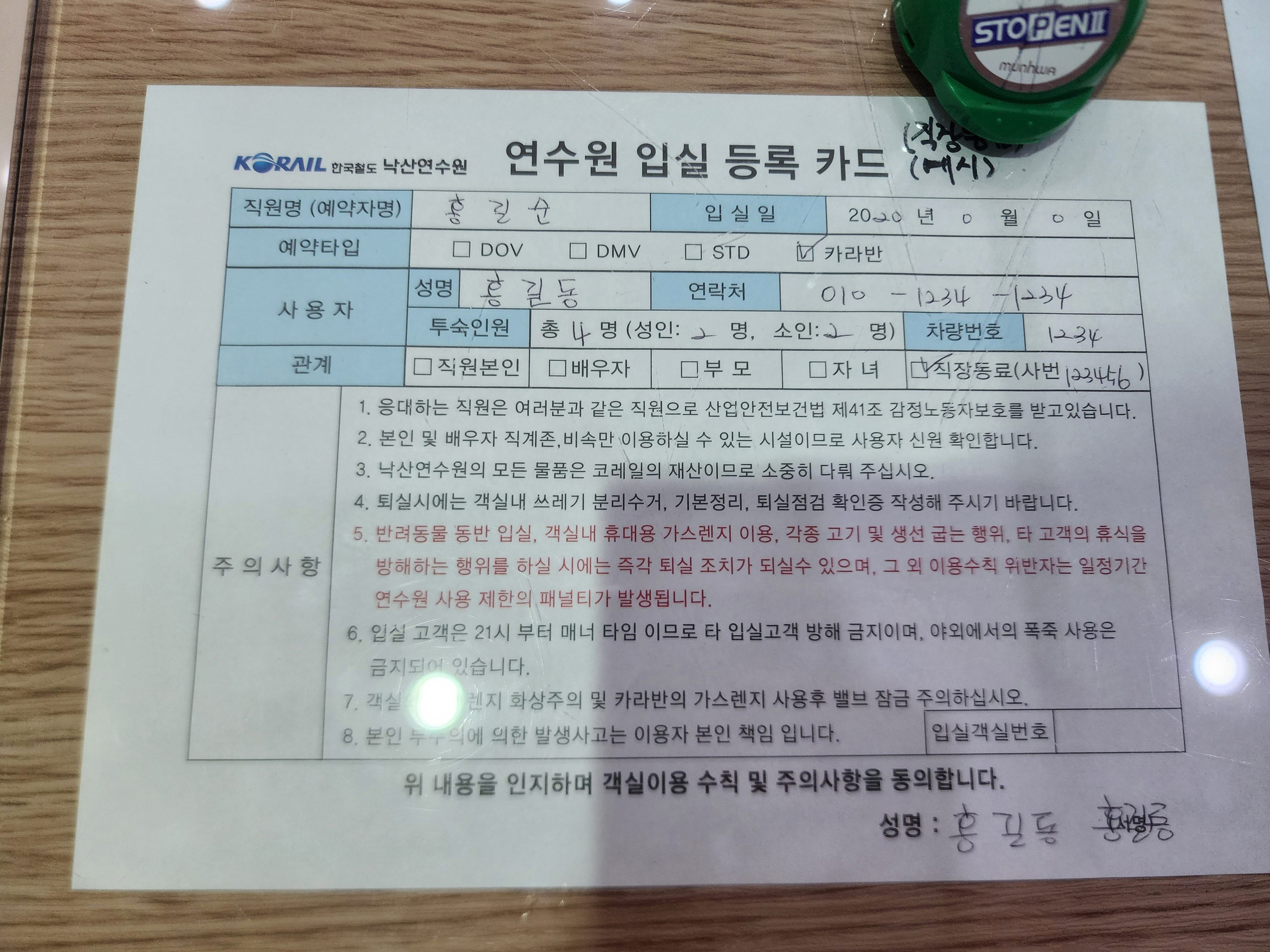 코레일 낙산연수원 방문 시 입실 등록 카드를 작성해야 합니다.