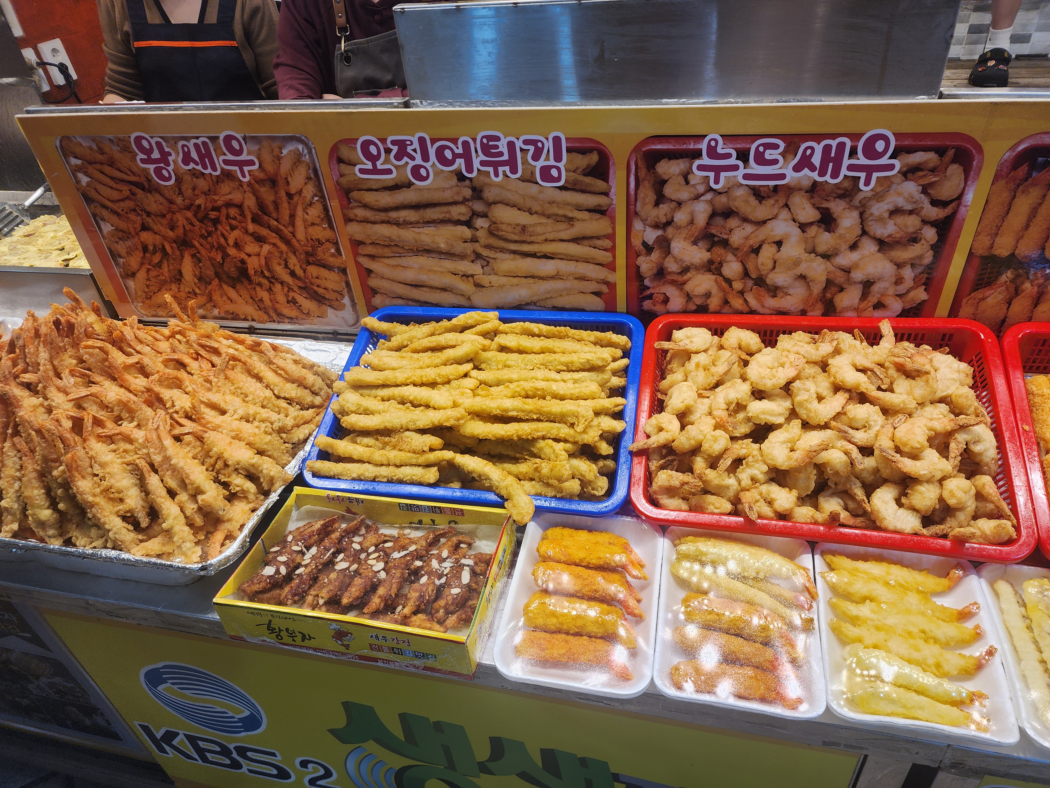 튀김이 매대에 엄청 쌓여 있는 모습을 볼 수 있습니다.