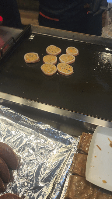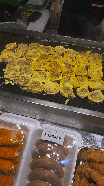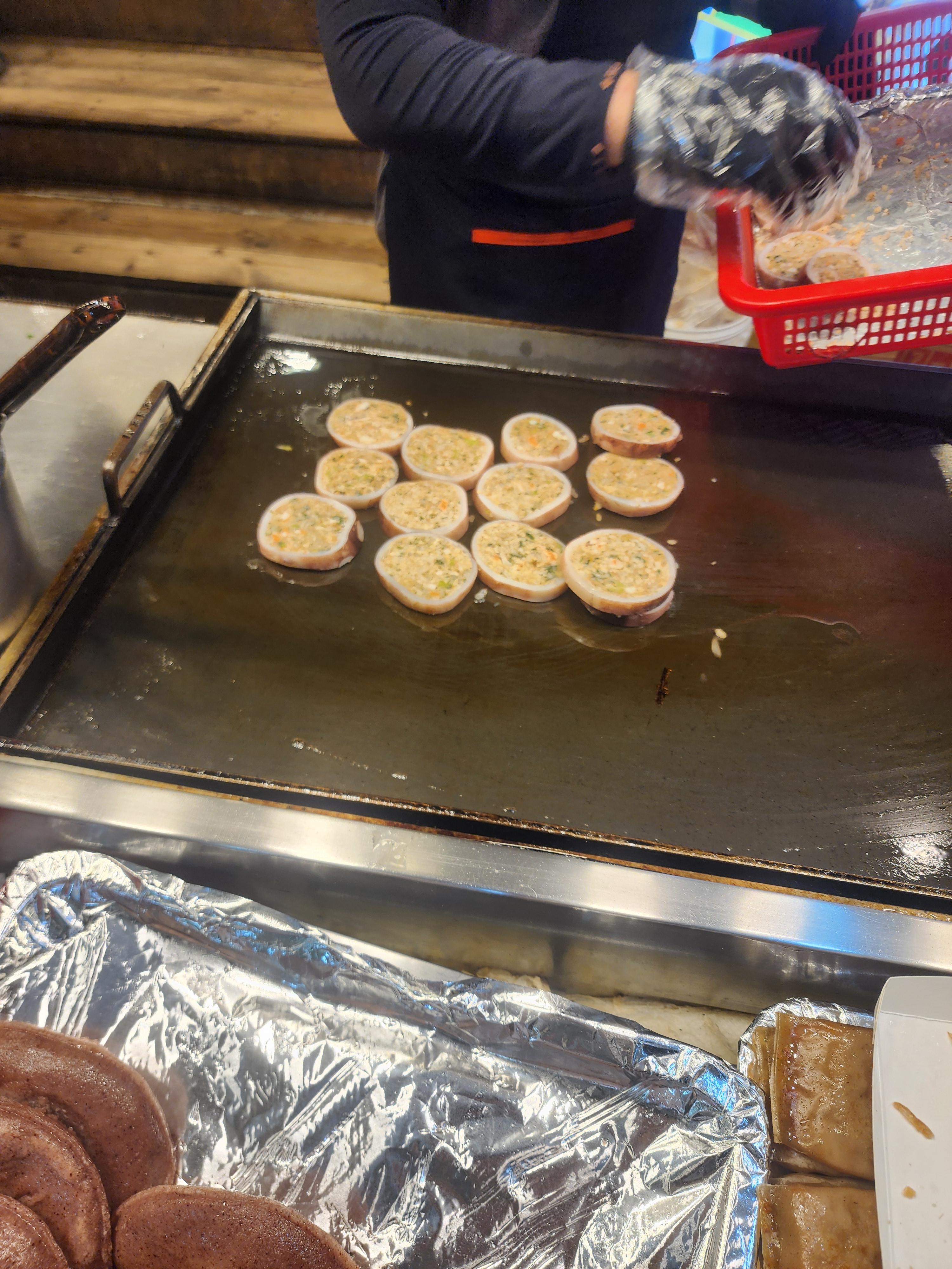 조금 기다리다 보니 저희 오징어순대가 계란까지 묻혀서 열심히 구워지고 있습니다.