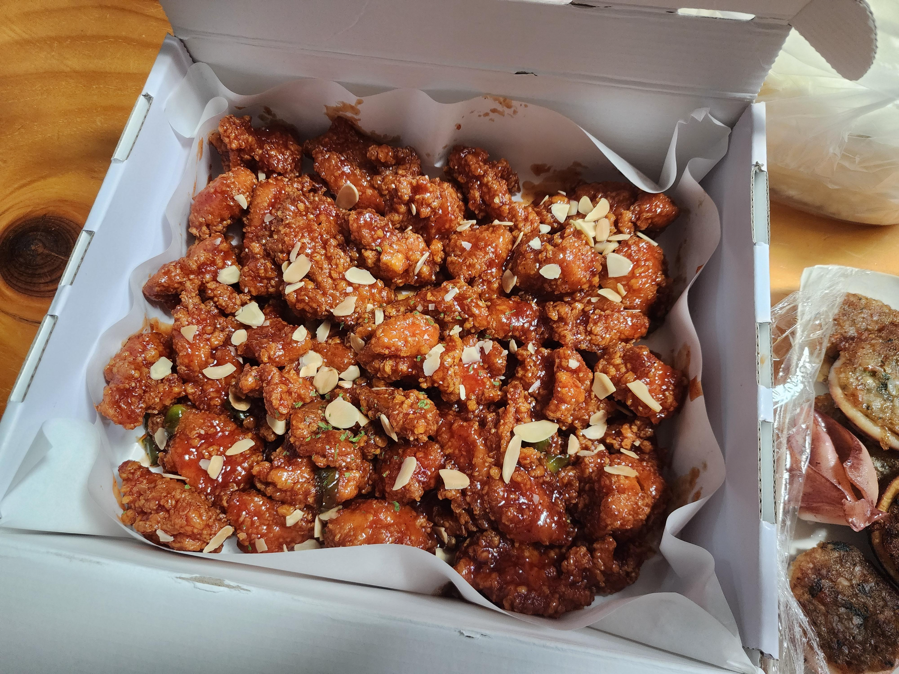 닭강정 위에 견과류도 뿌려져서 더 먹음직스러운 느낌이 납니다.