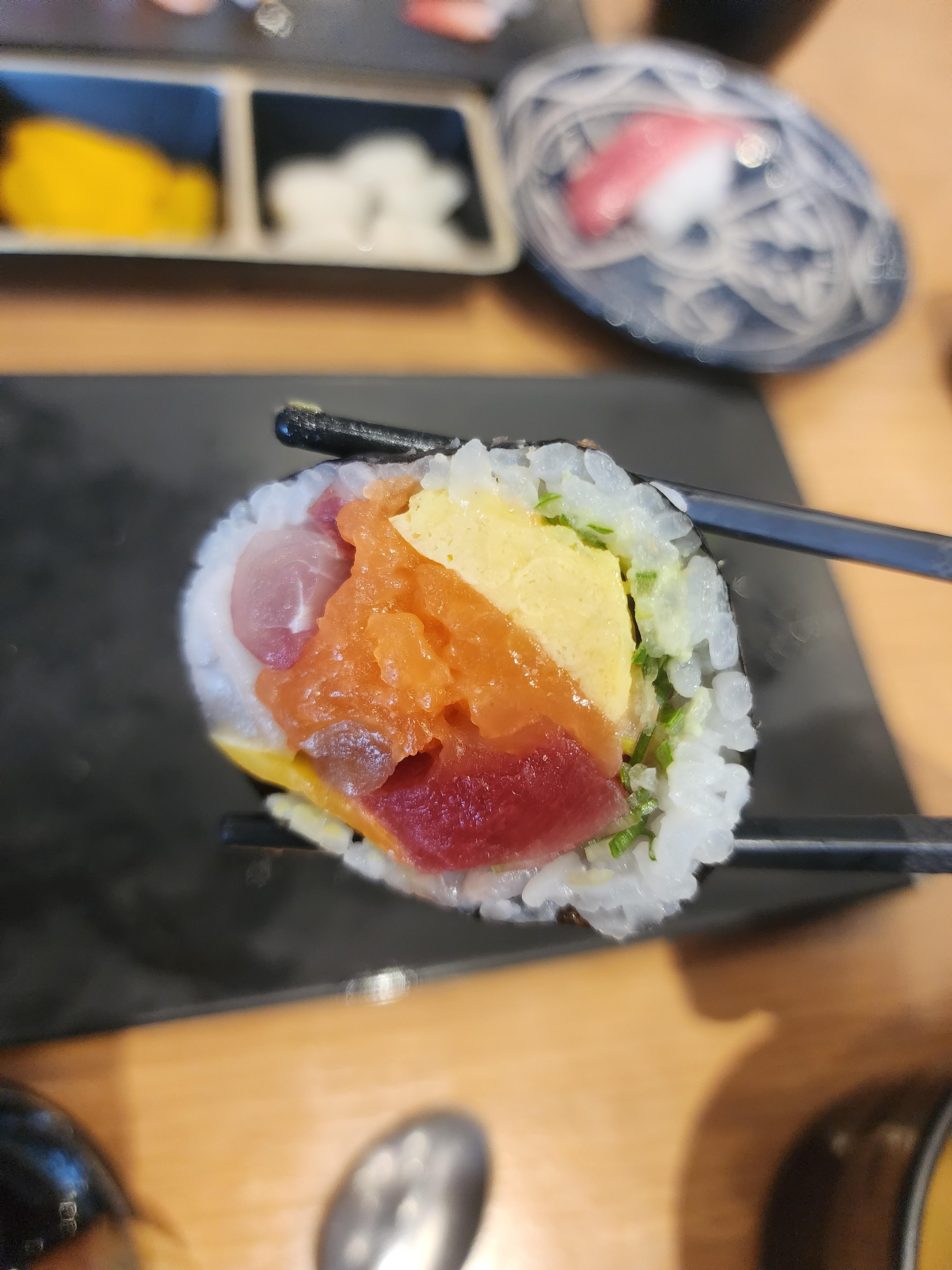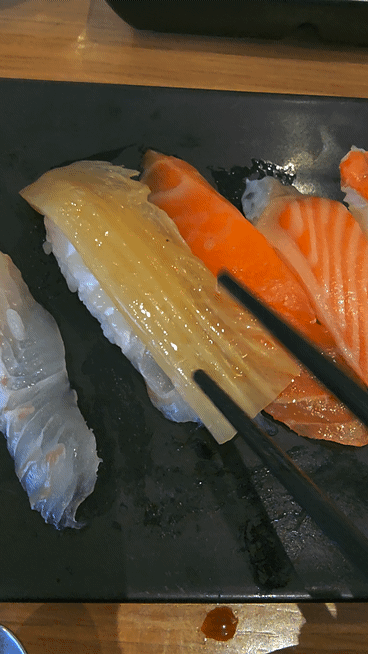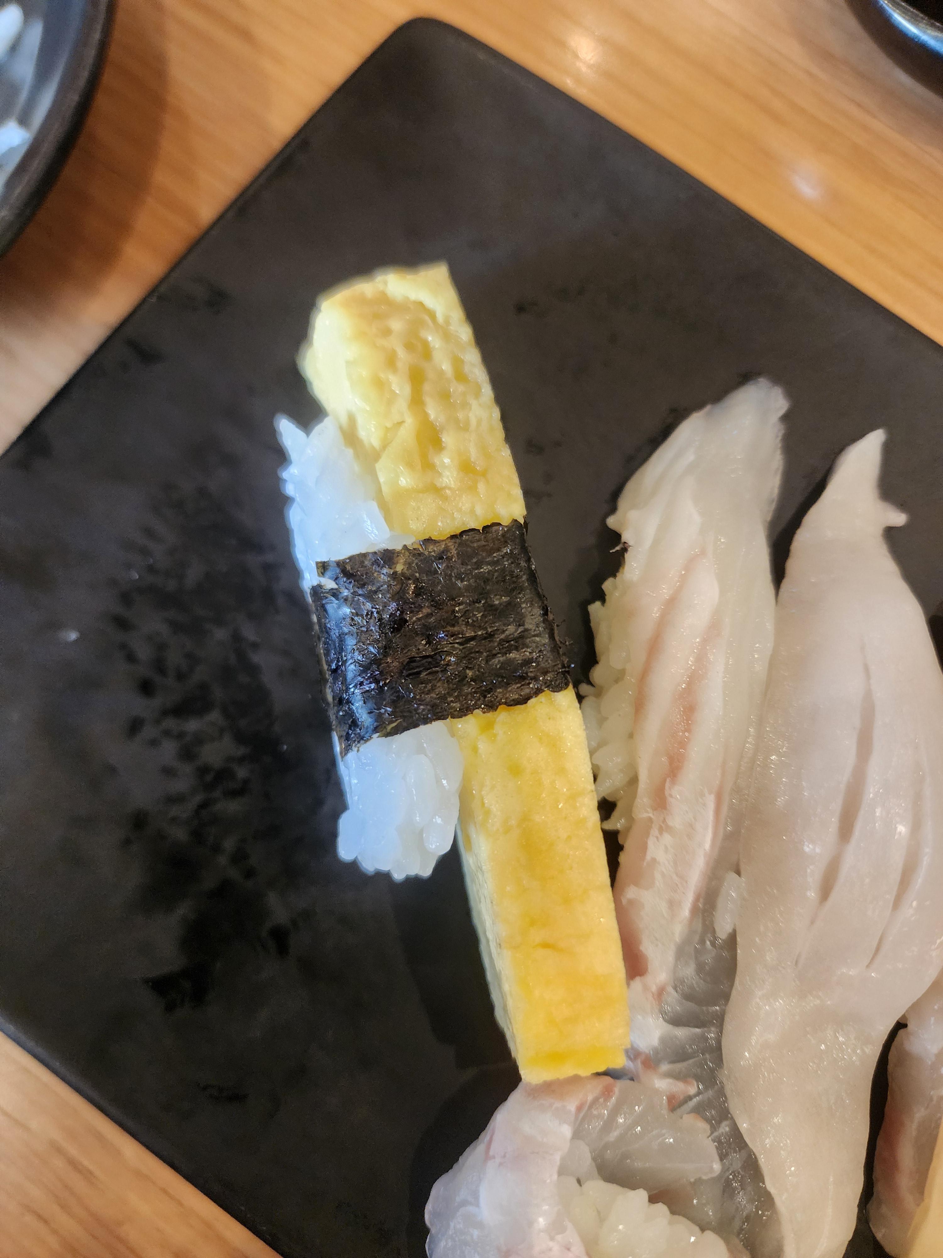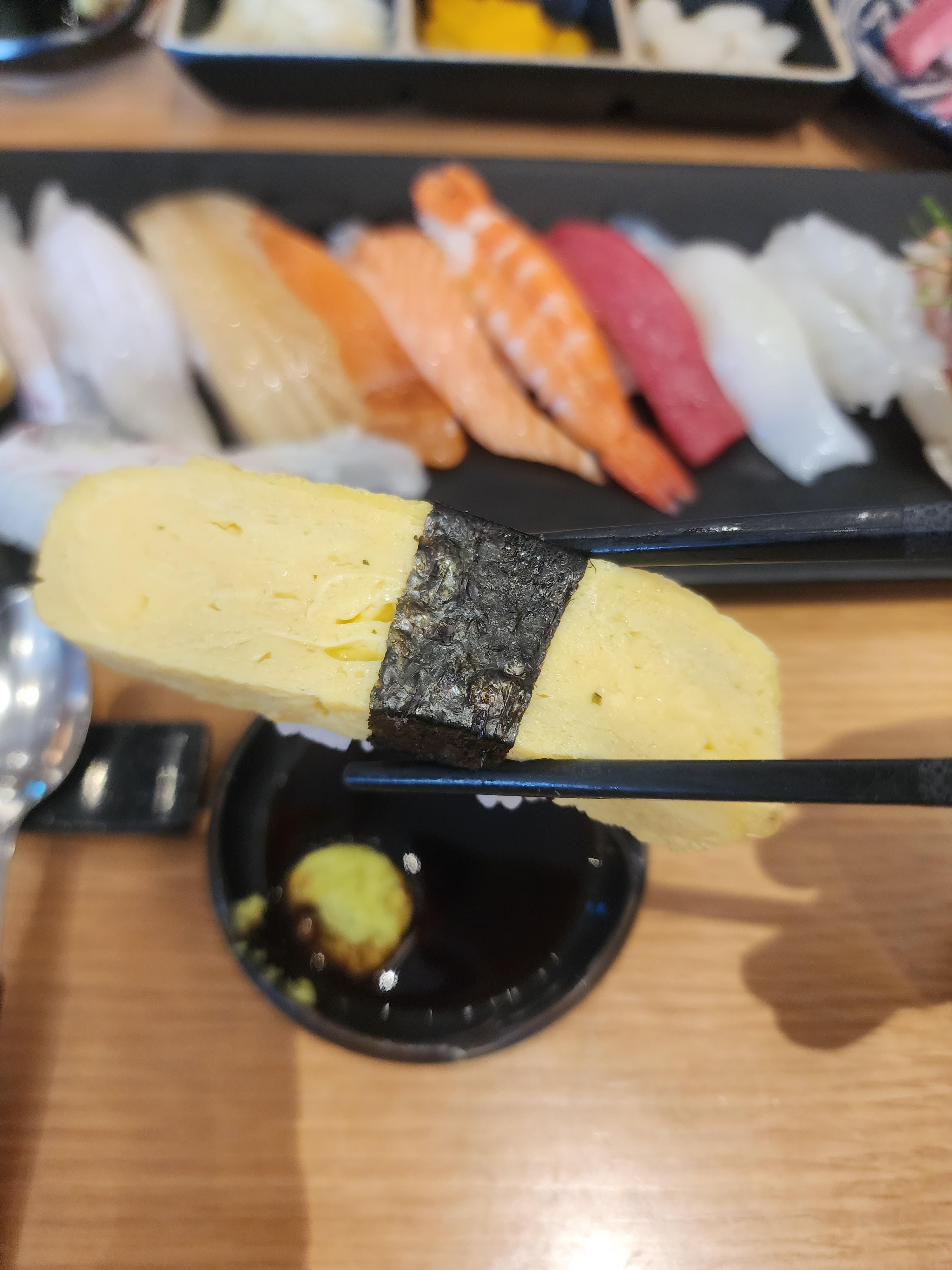 저는 초밥을 왼쪽부터 순서대로 먹어서 제일 먼저 계란 초밥을 먹었습니다.