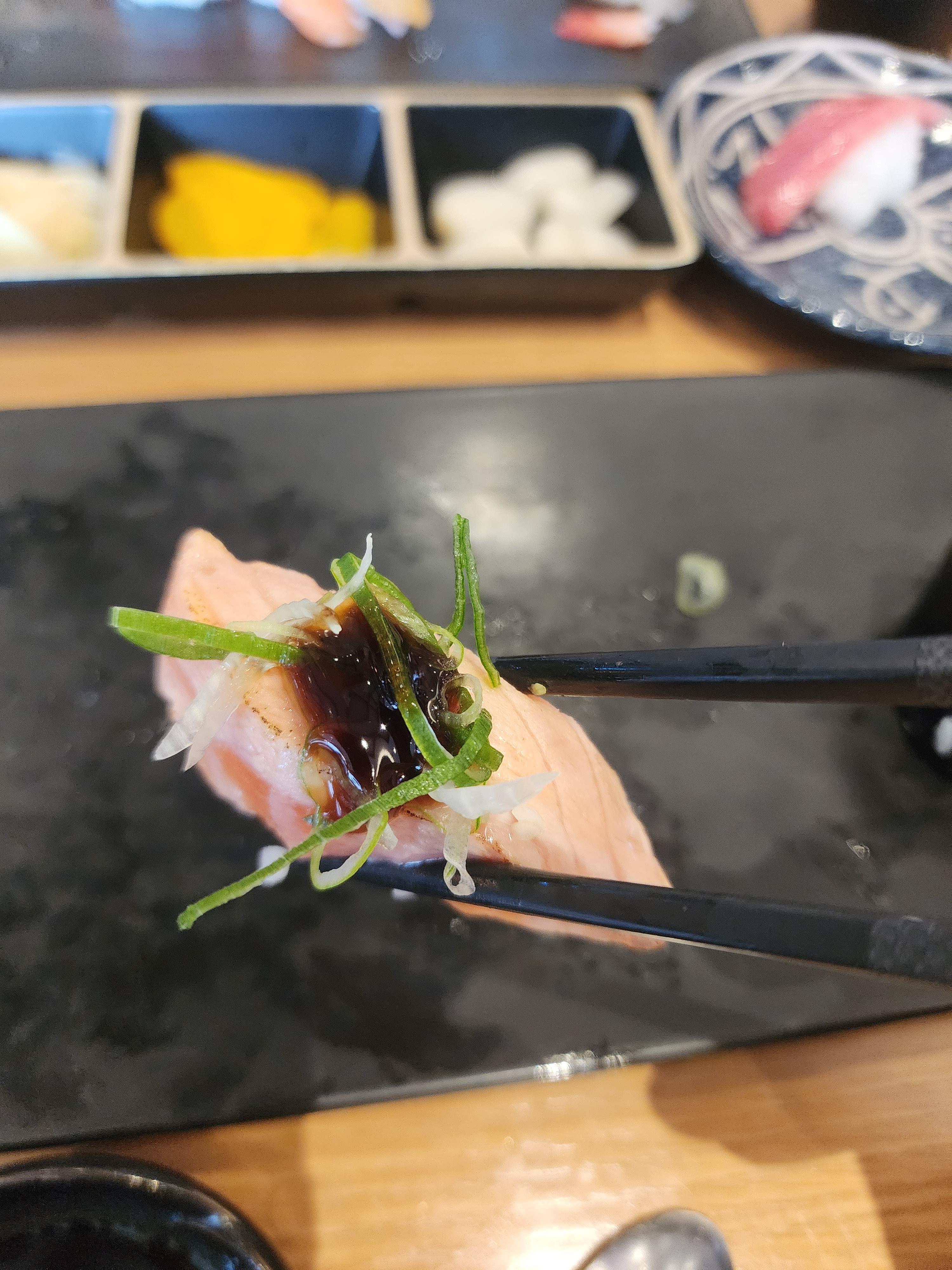 연어를 위에만 살짝 익히고 소스와 특이하게 대파를 얹어서 먹는 초밥입니다.