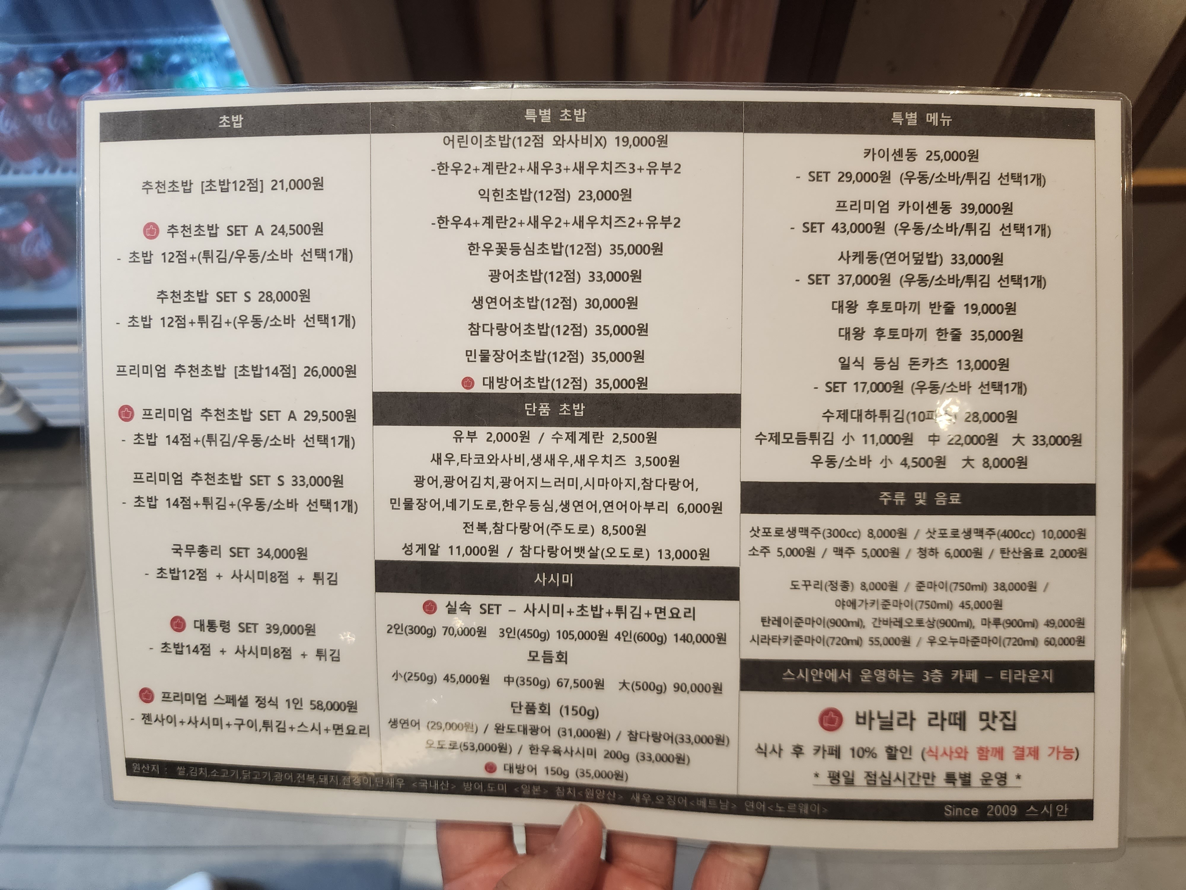 스시안 카페 메뉴 및 가격입니다.