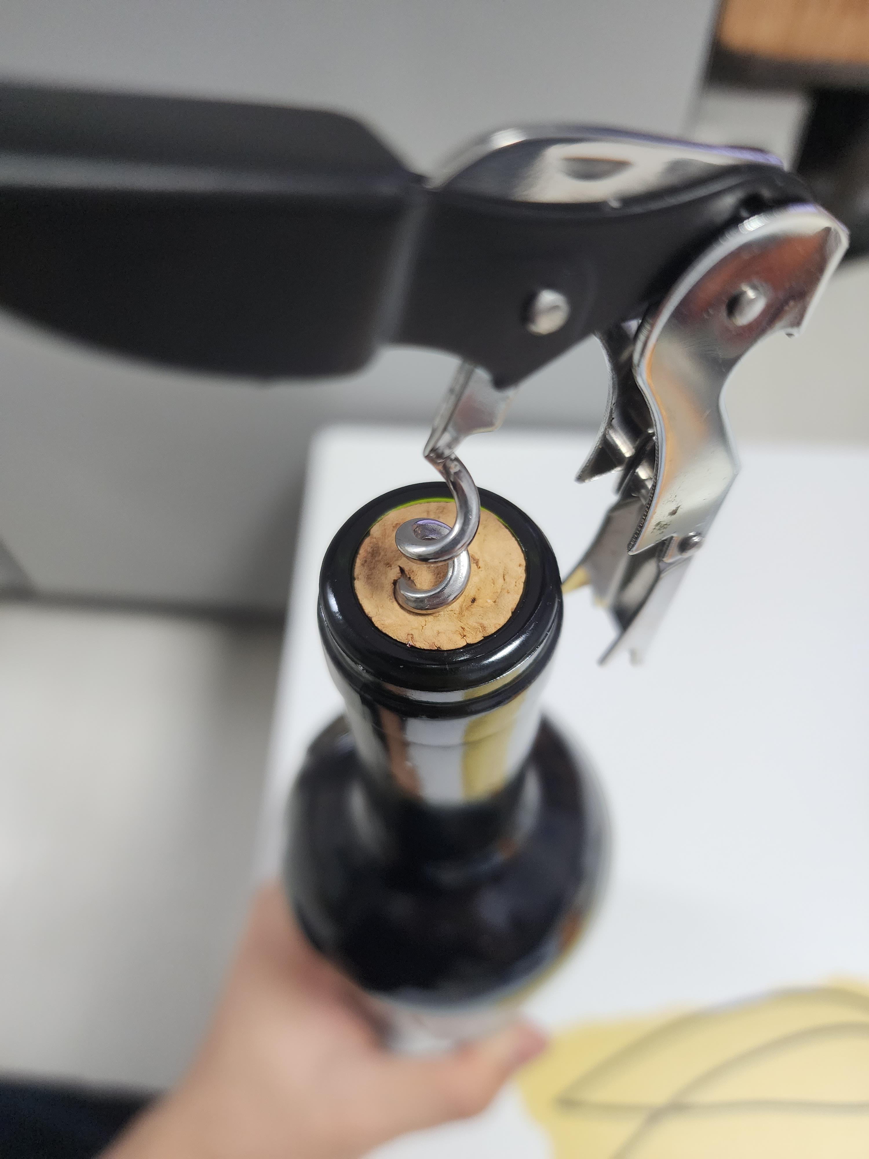 그 상태로 병뚜껑에 지렛대 원리를 이용하여 코르크 마개를 열어주면 됩니다.