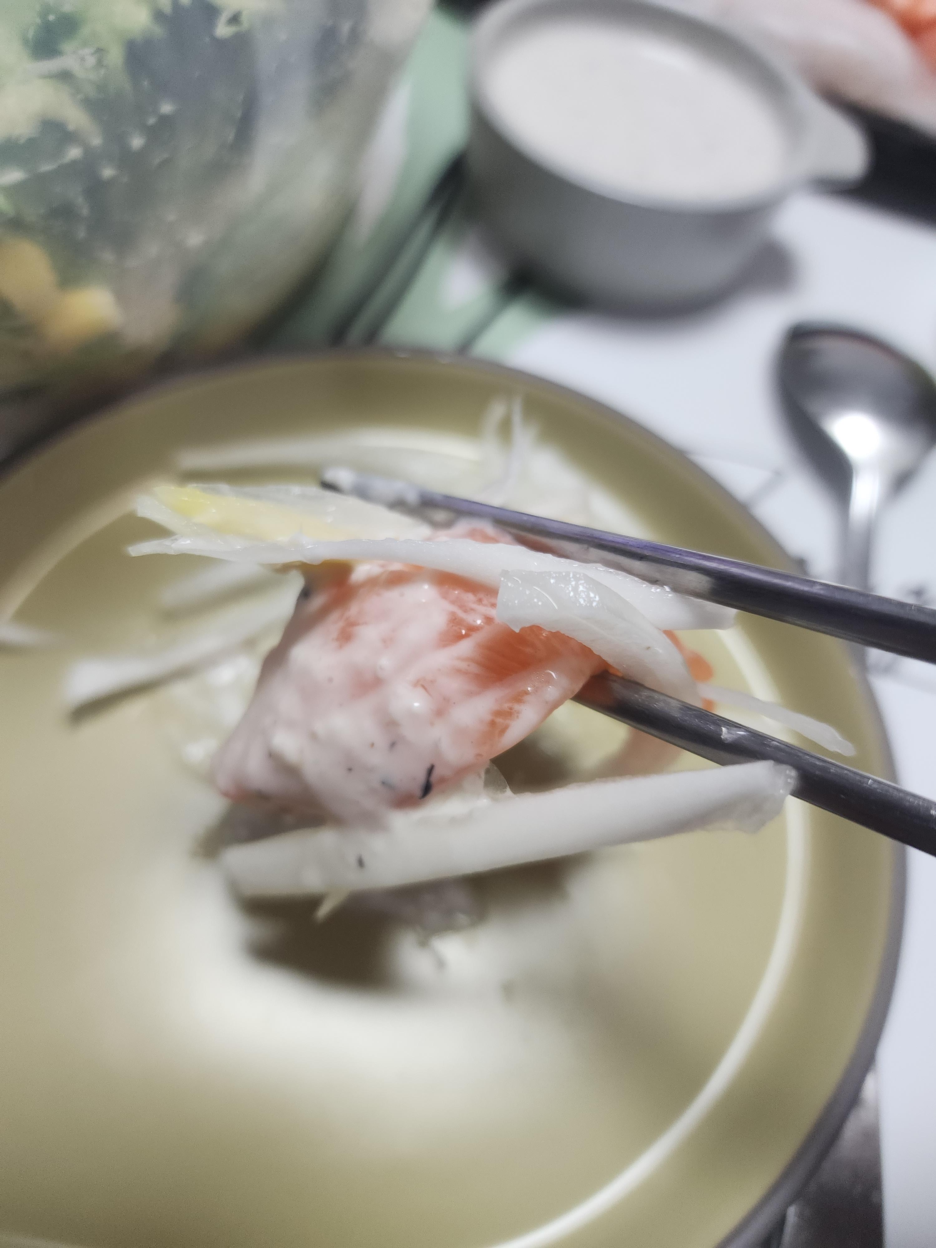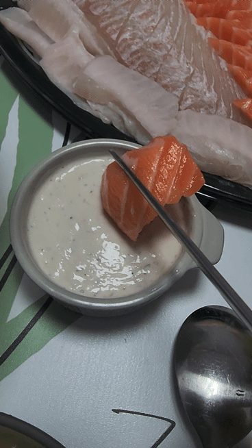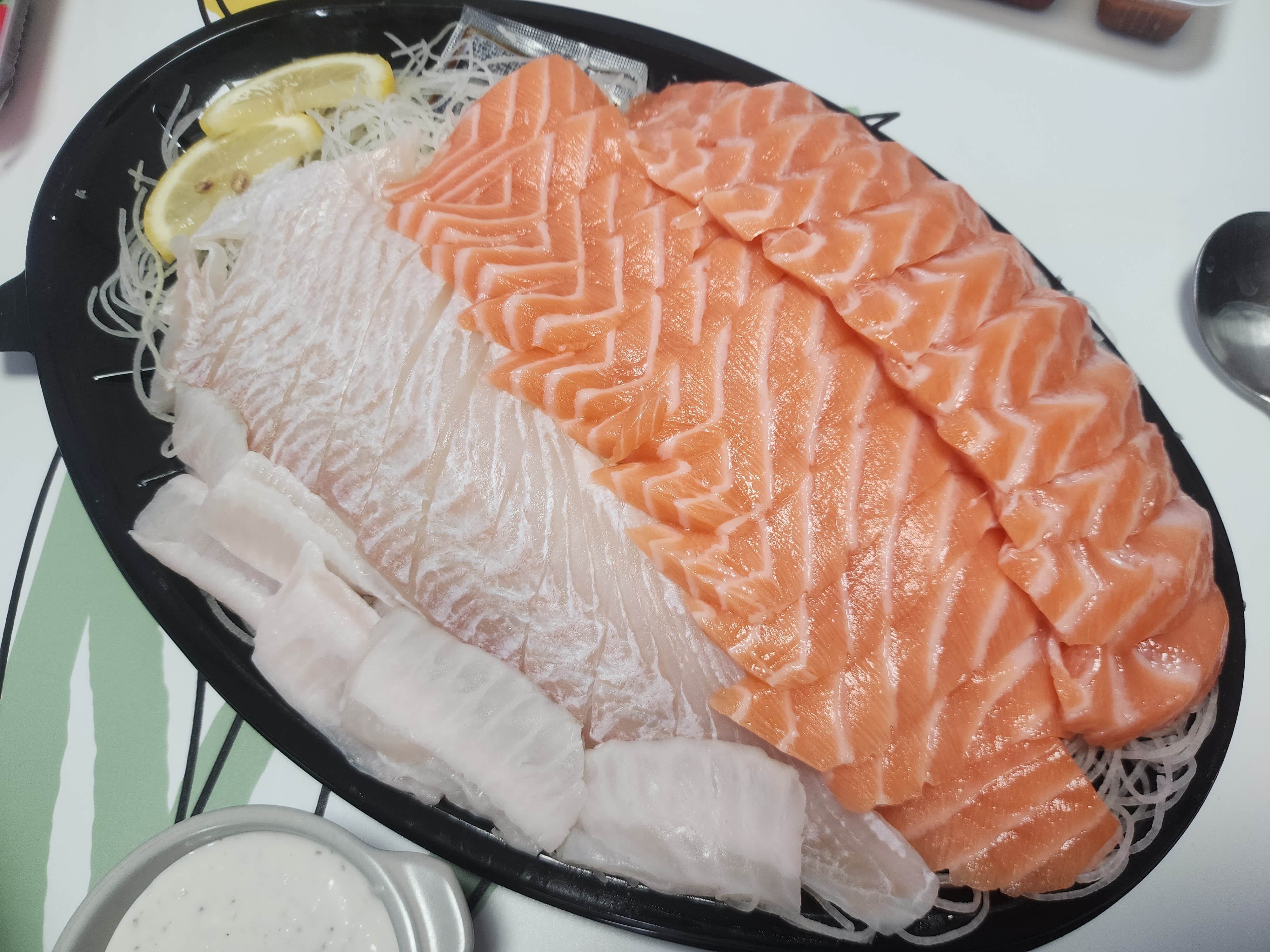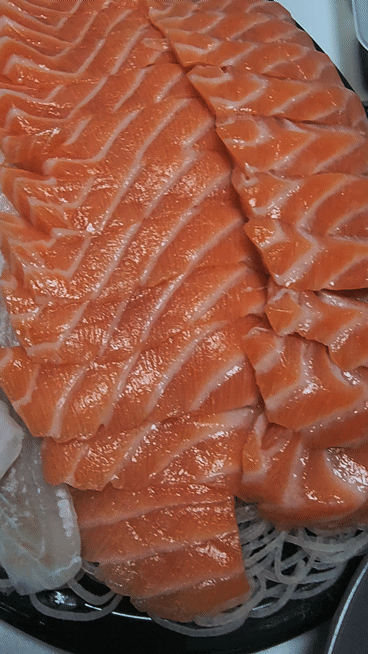 먼저 맛있어 보이는 연어회를 먹었습니다.