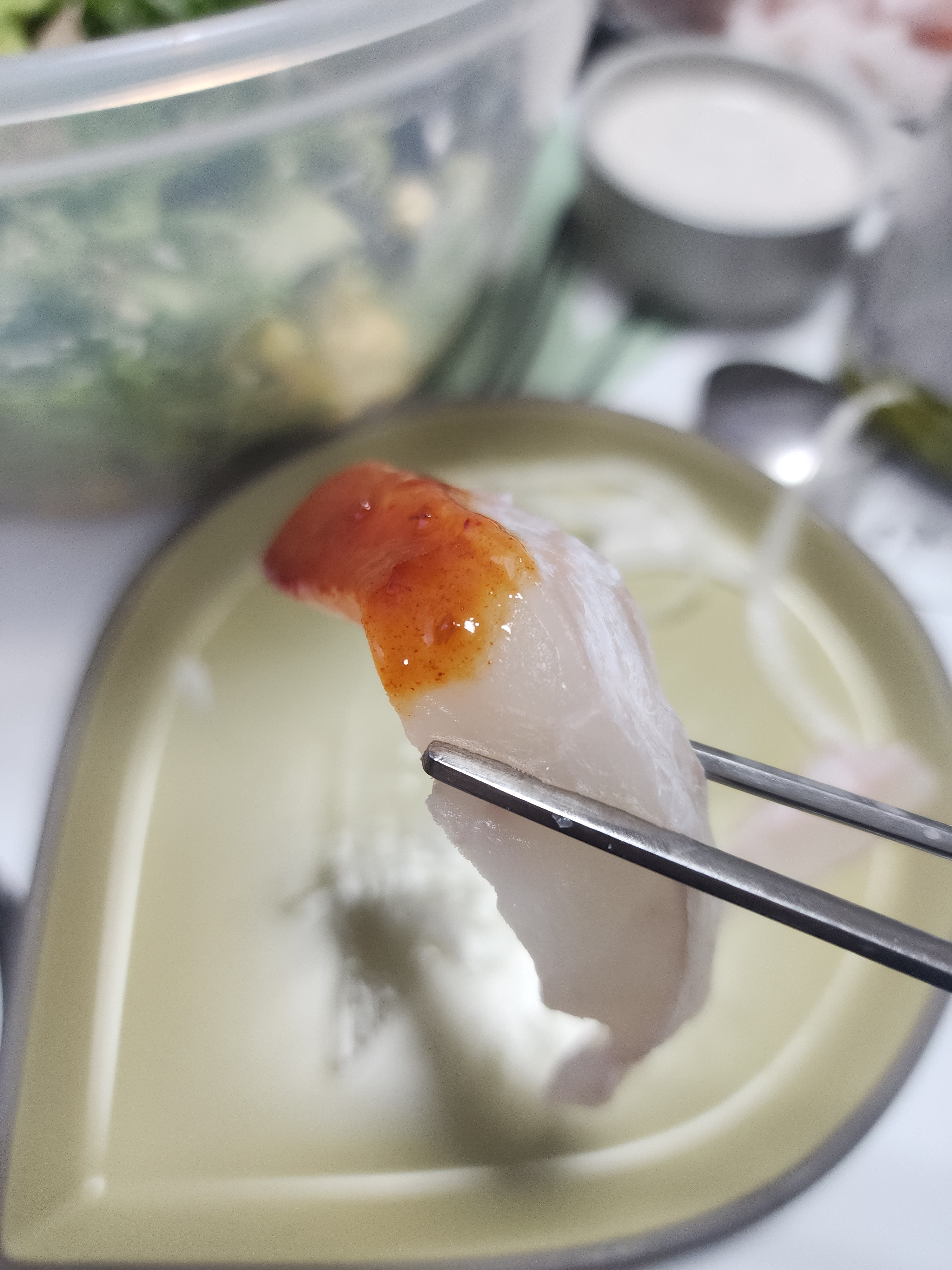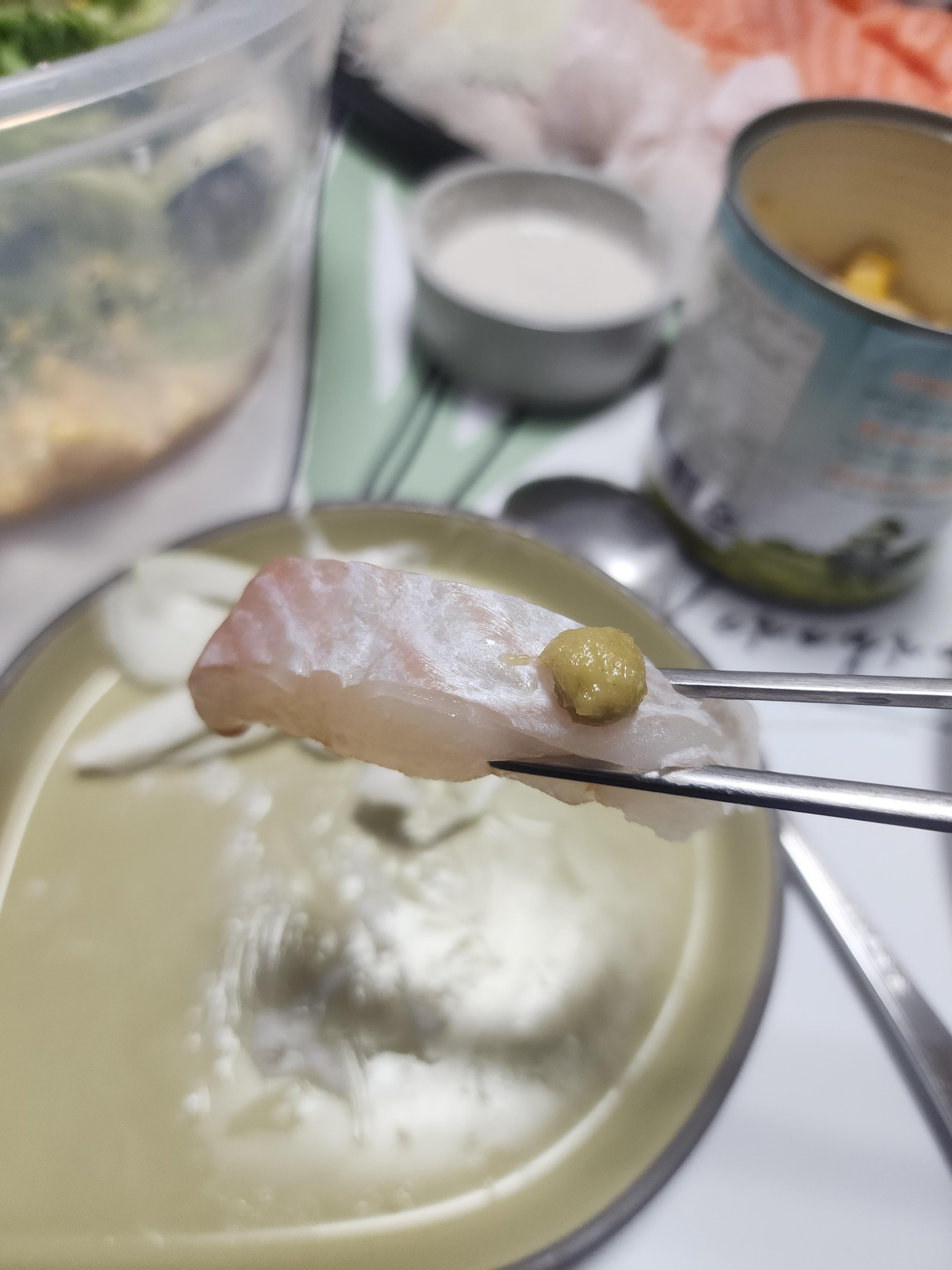 비린 맛을 감춰보고자 와사비 가득 올려서 먹었습니다.