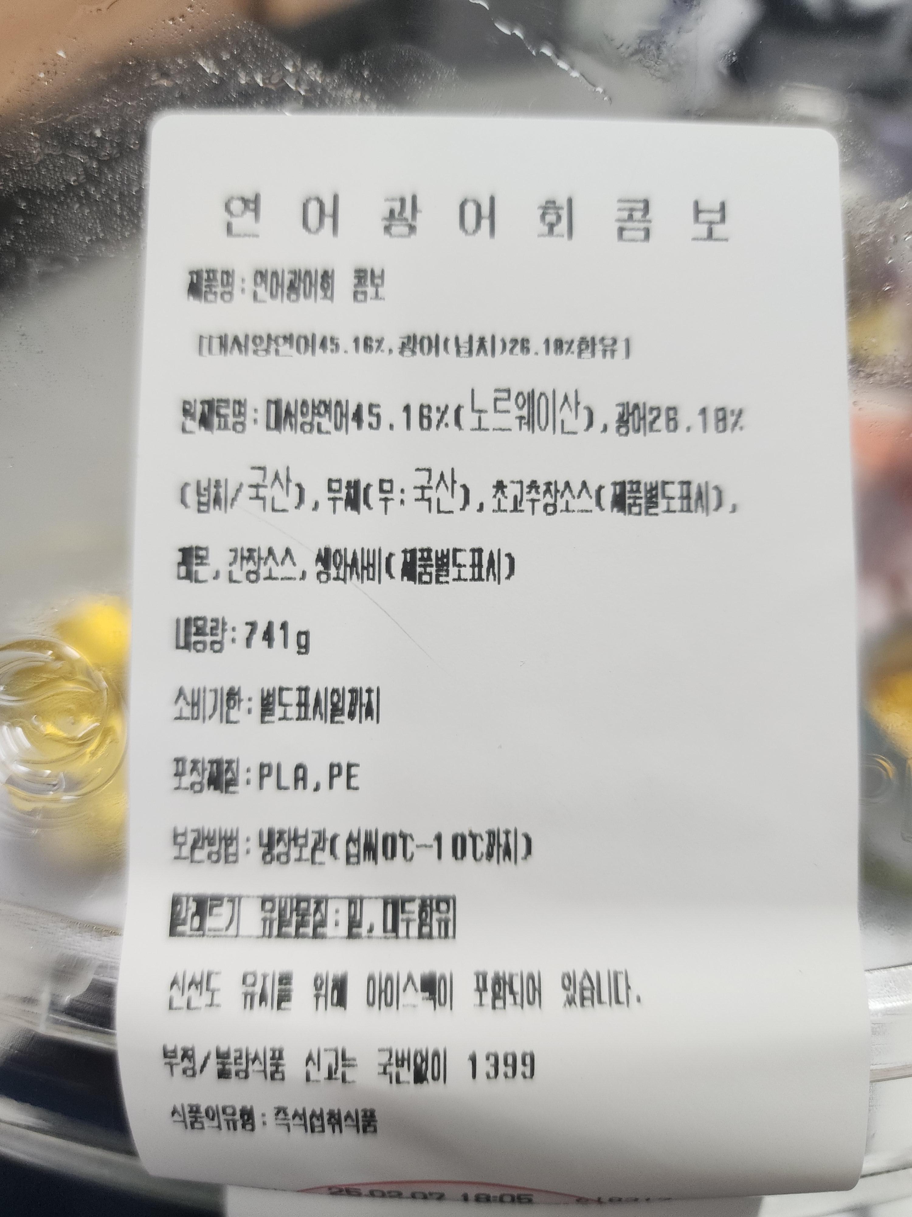 해당 연어광어회 콤보는 2월 7일 18시 05분에 나왔다고 적혀 있습니다.