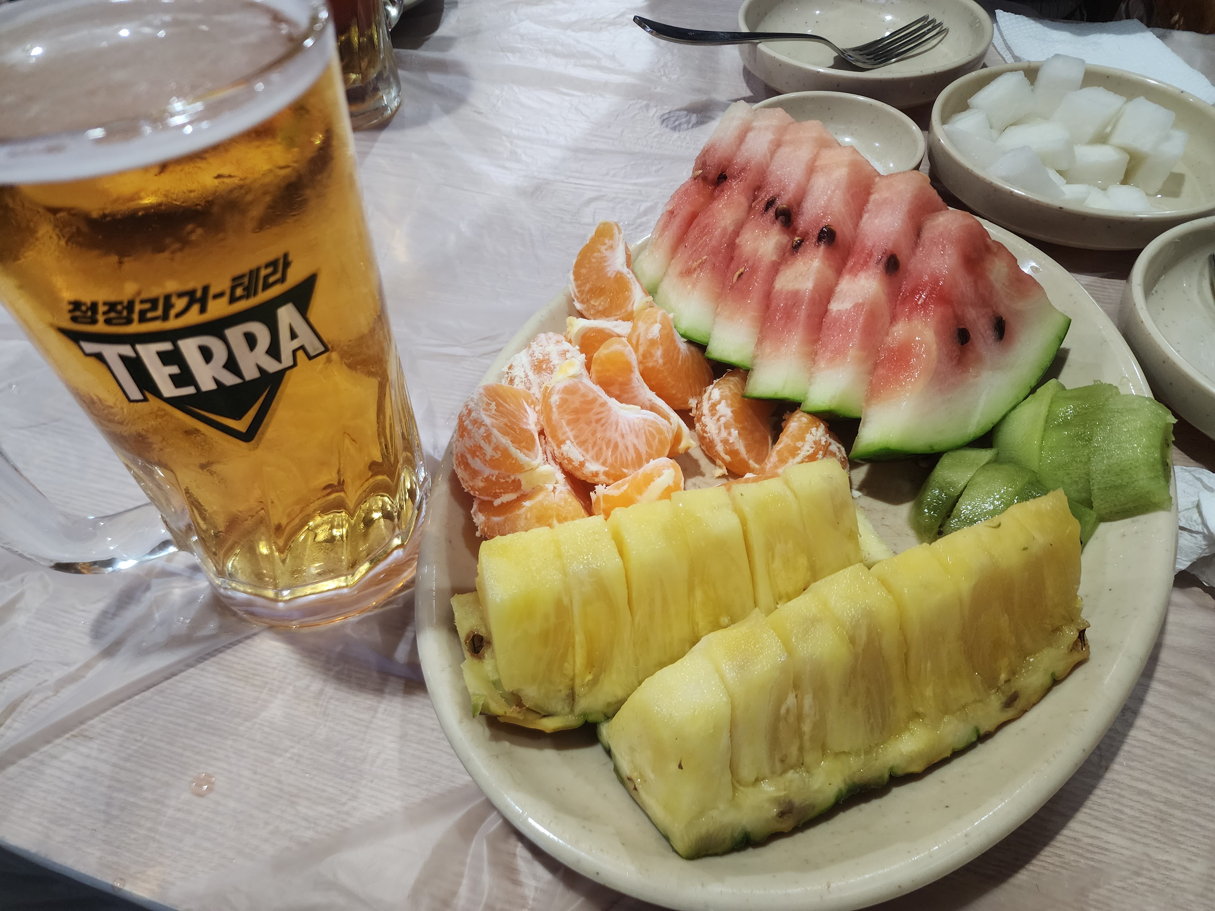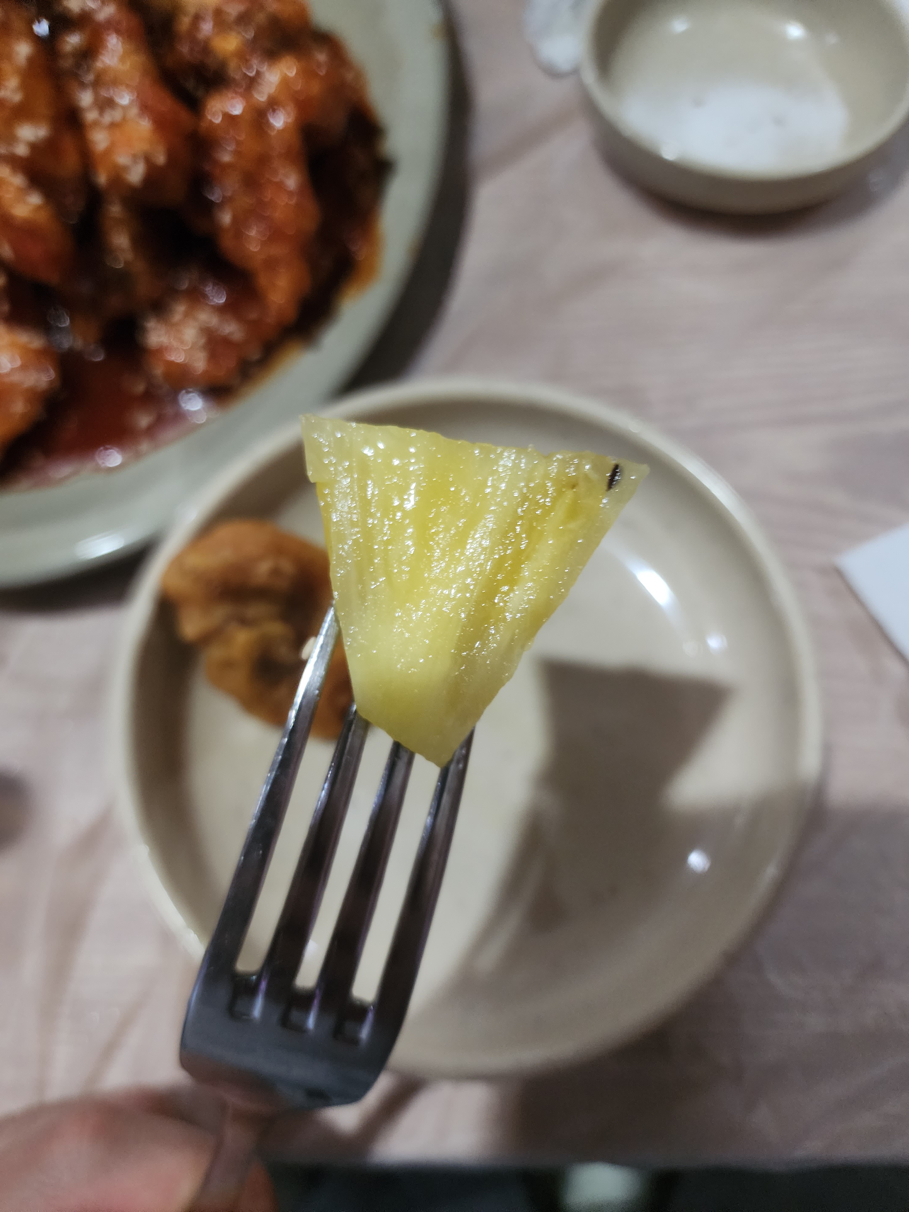 사장님께서 추천해 주신 대로 후라이드 치킨을 먹은 후 파인애플을 먹었습니다.