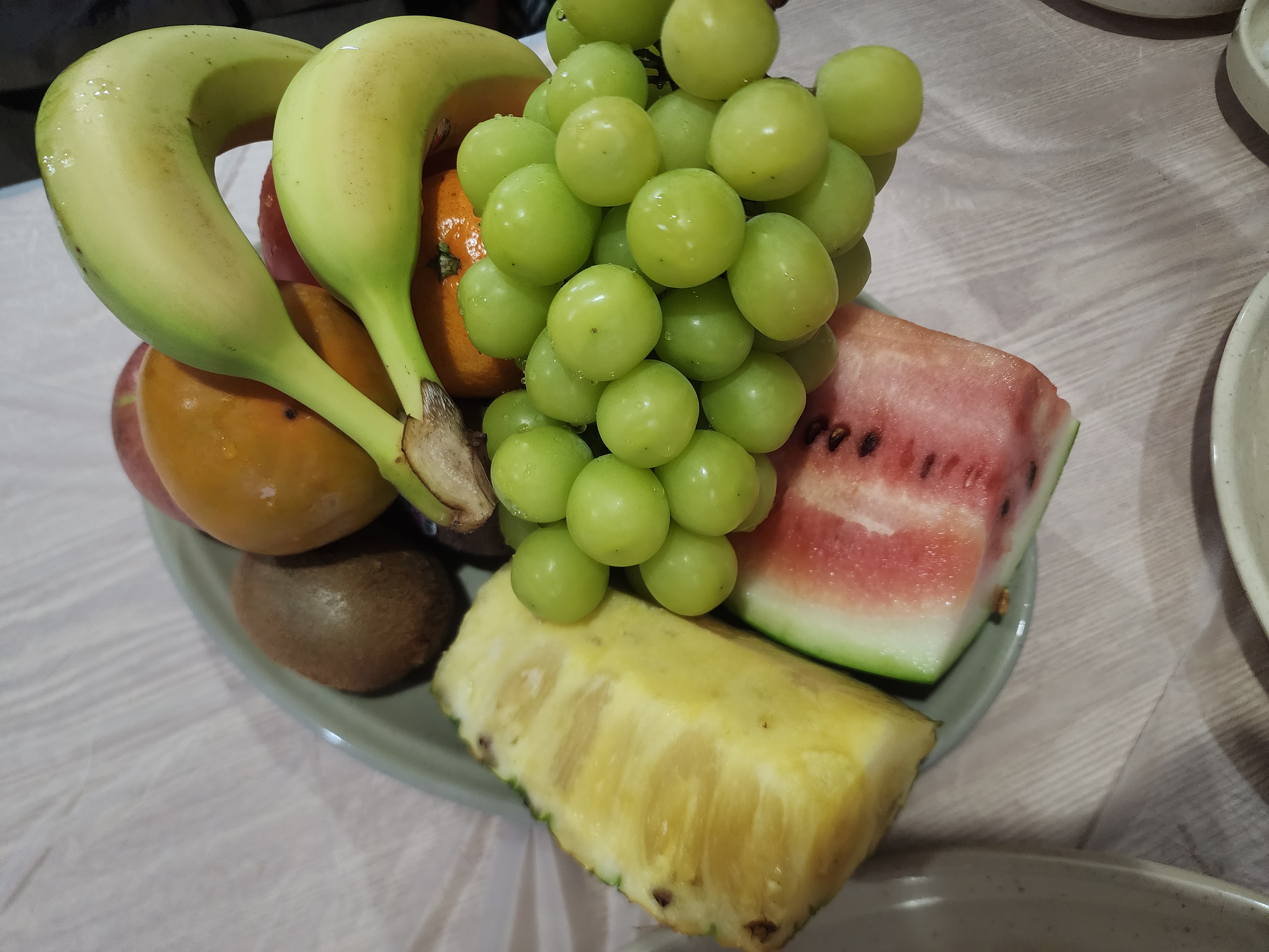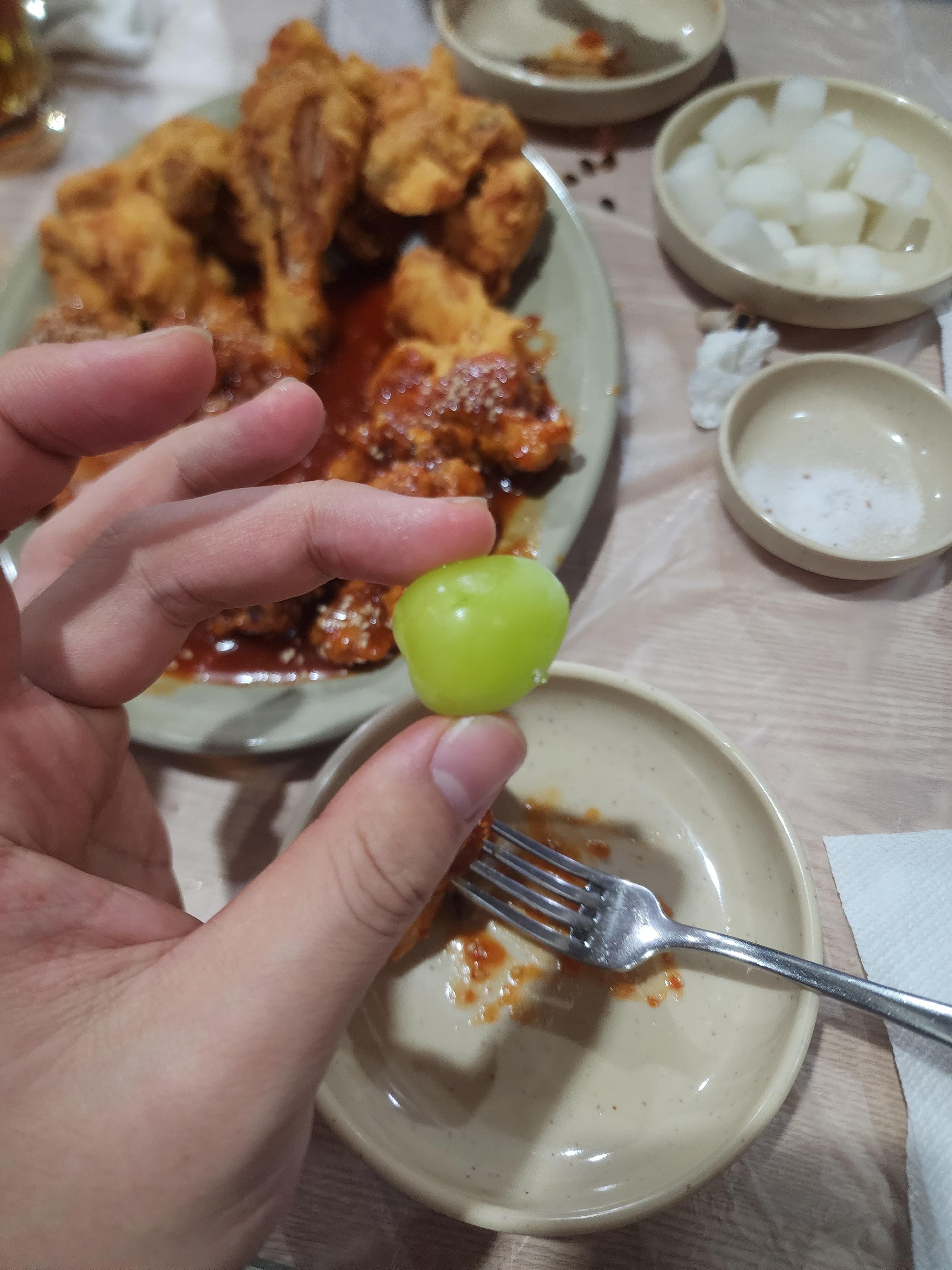 양념 치킨을 먹은 후 샤인머스켓을 먹었습니다.