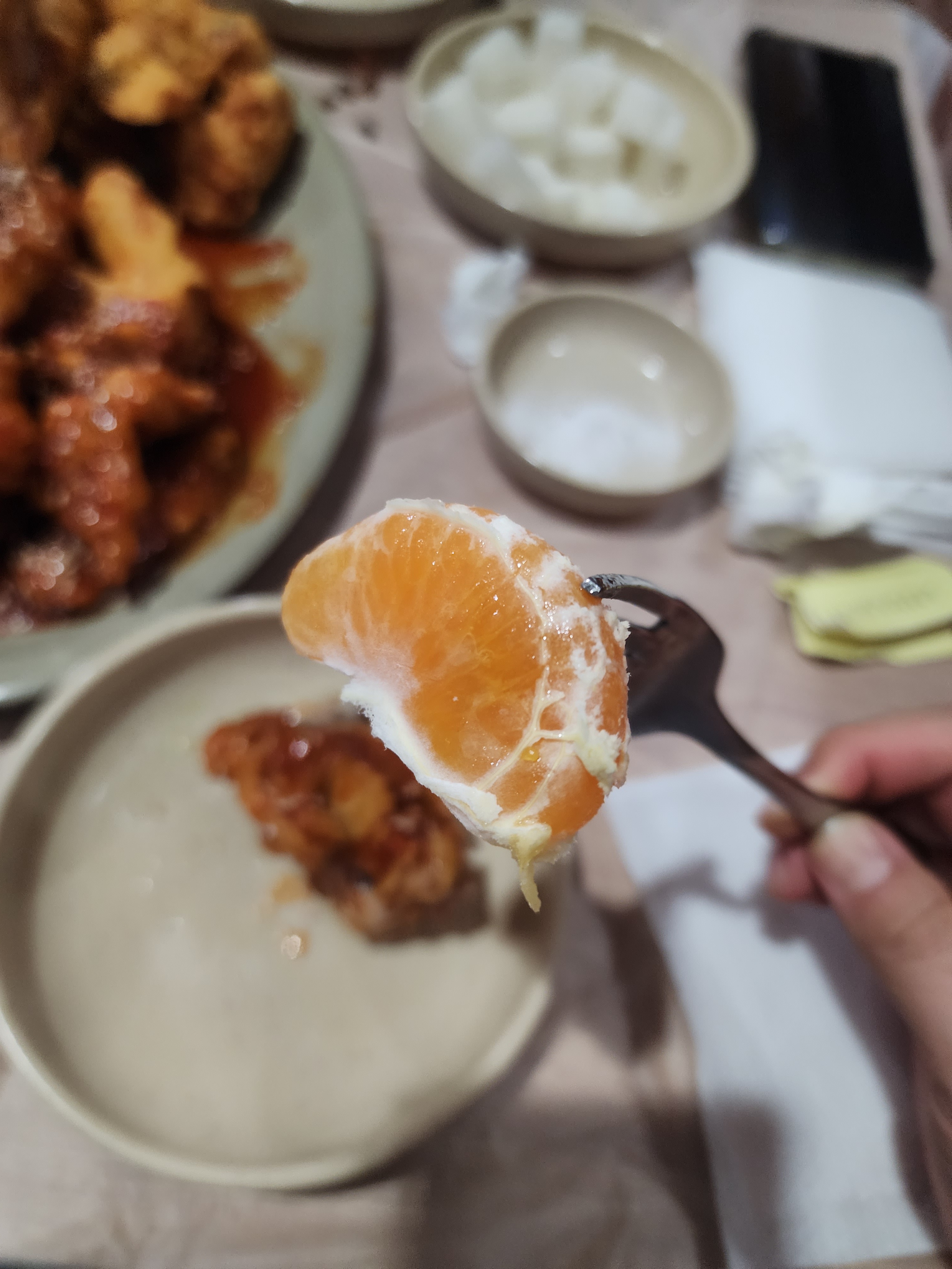 저는 양념 치킨을 먹다 보면 좀 물리는데 치킨무도 먹고 과일도 먹으니까 좀 덜 물리는 것 같습니다.