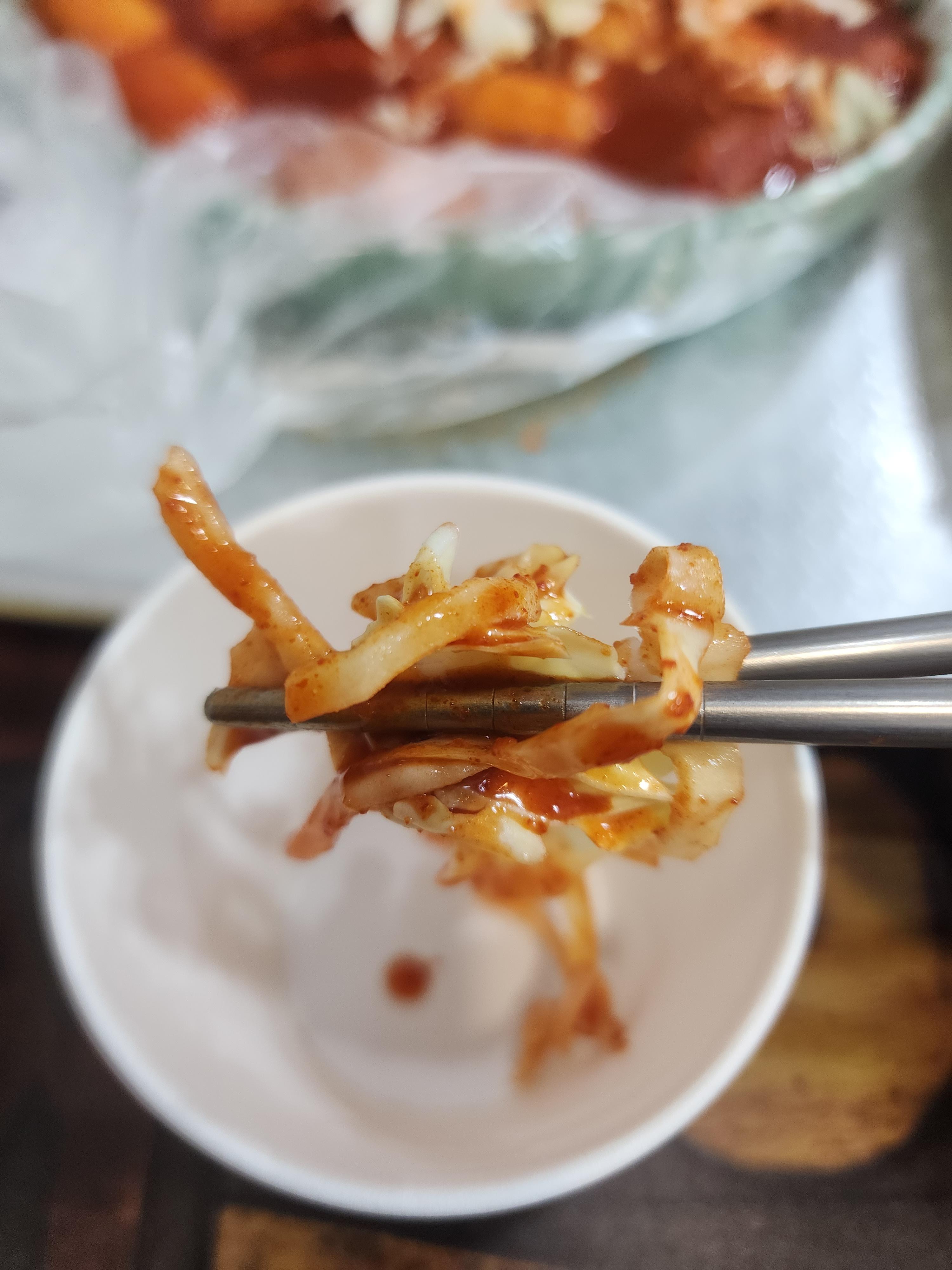 아삭한 식감이 살아 있고 생양배추의 프레시한 느낌과 떡볶이 소스의 매콤함이 잘 어울립니다.