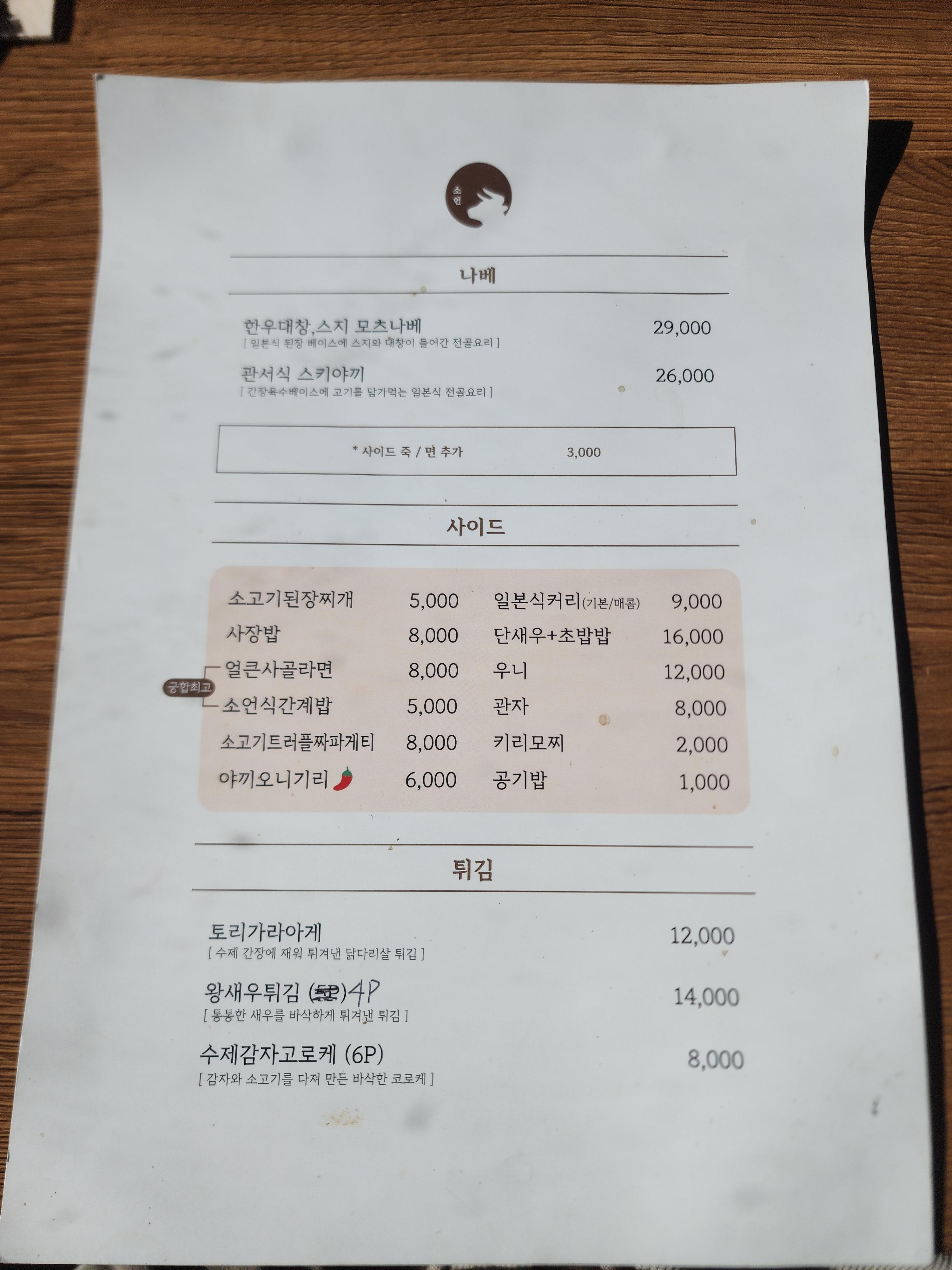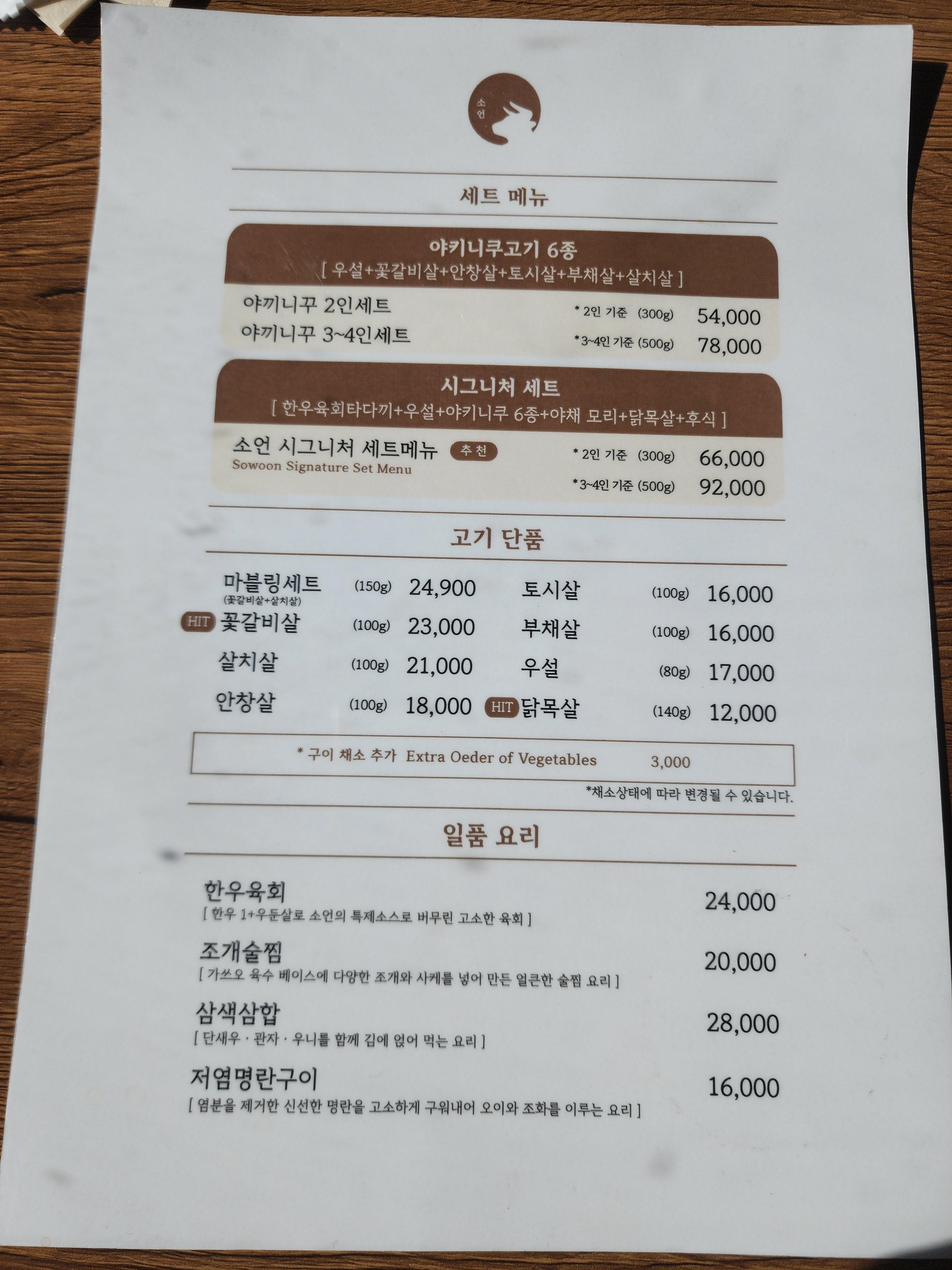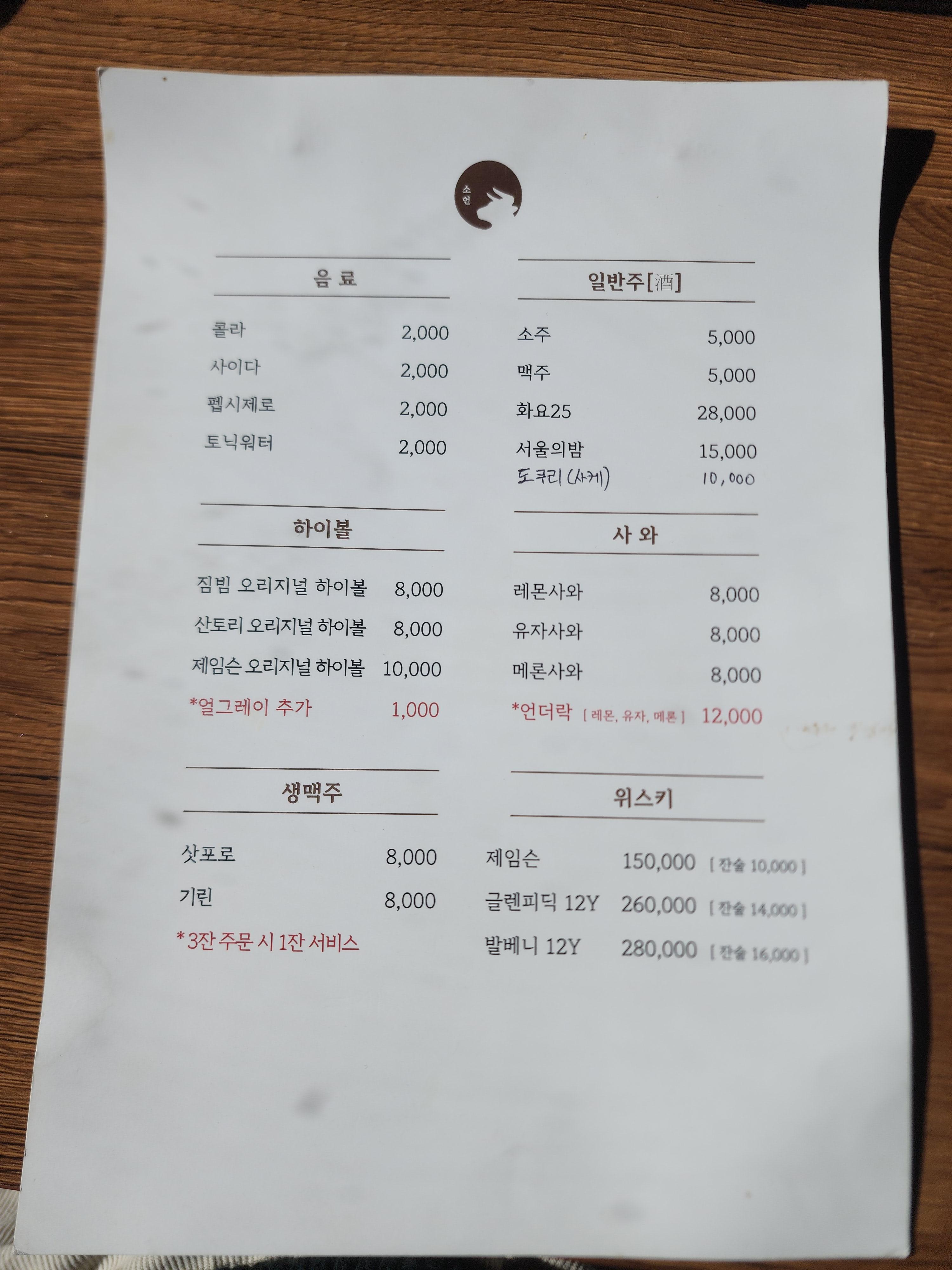 소언 메뉴 및 가격입니다.