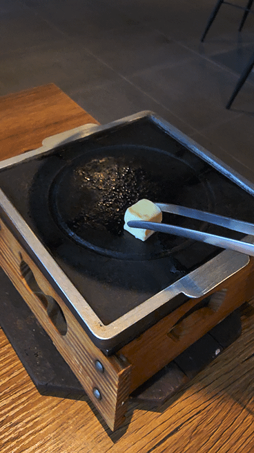 규카츠를 굽기 전 같이 나온 버터를 화로에 녹여 줍니다.