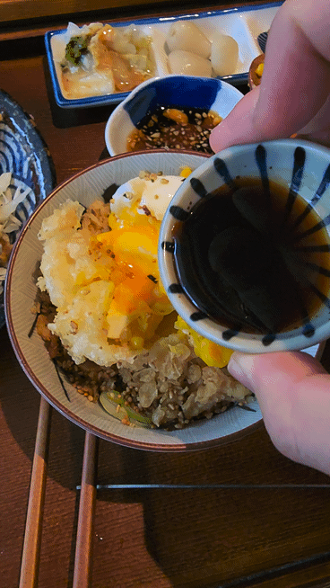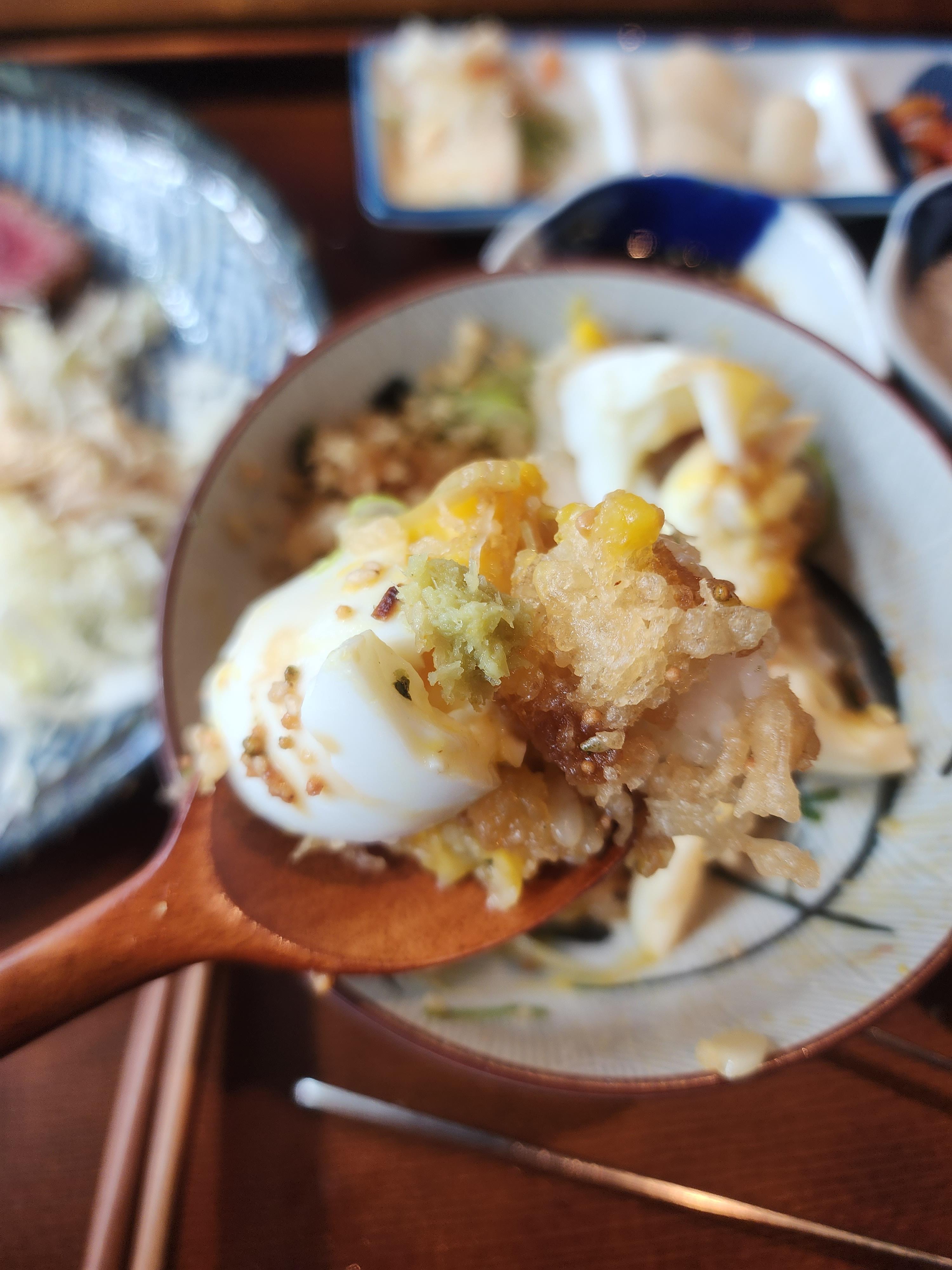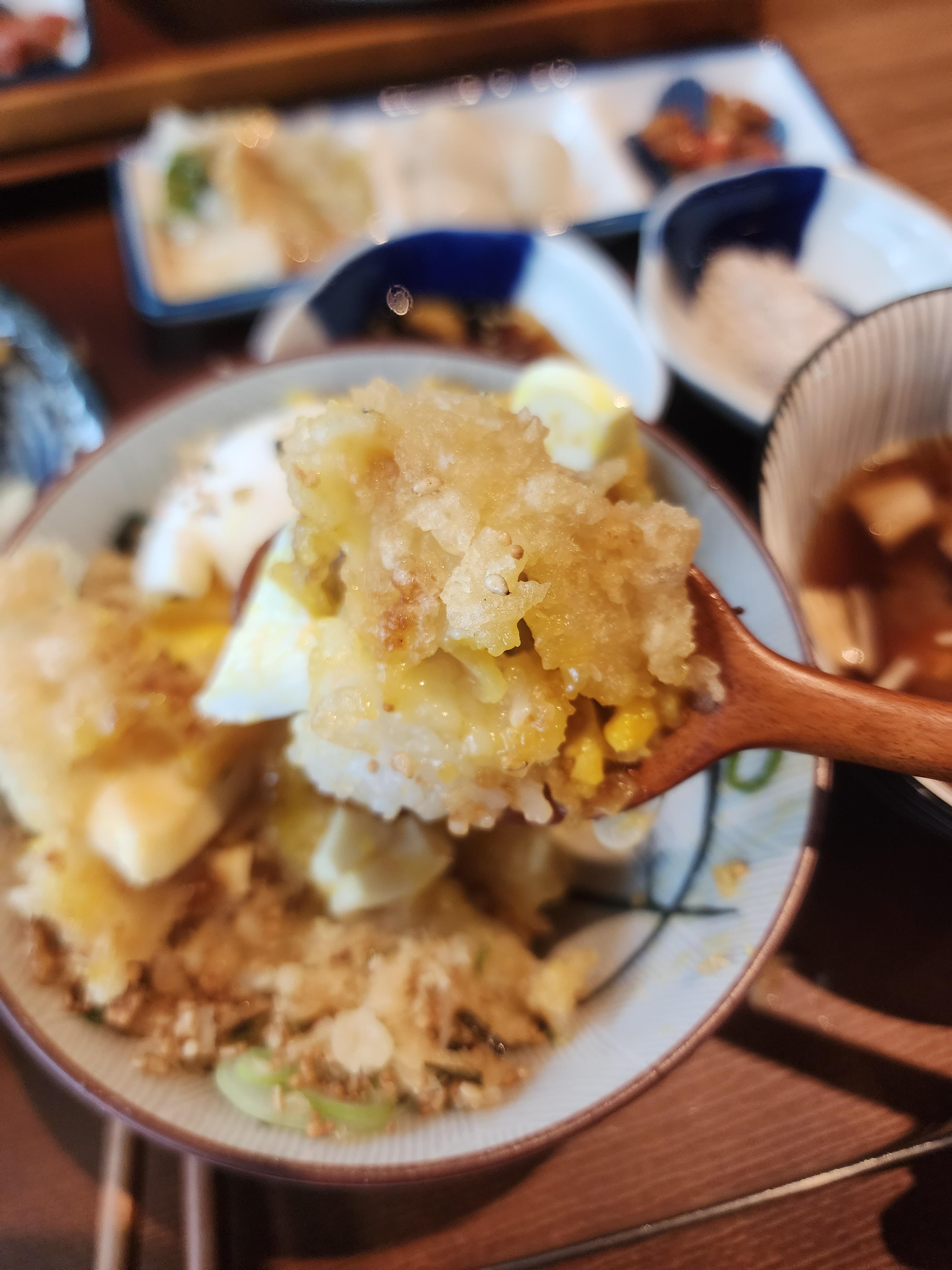 그리고 밥도 그냥 밥만 주는 게 아닌 계란 튀김과 튀김가루가 밥 위에 뿌려져 나옵니다.