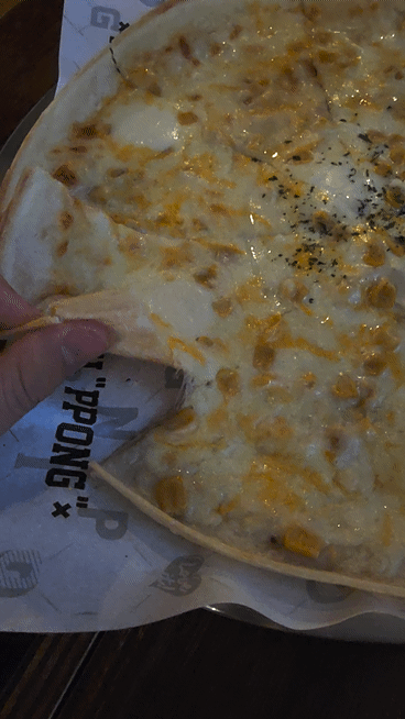 방금 나와서 그런지 피자 치즈가 잘 늘어납니다.
