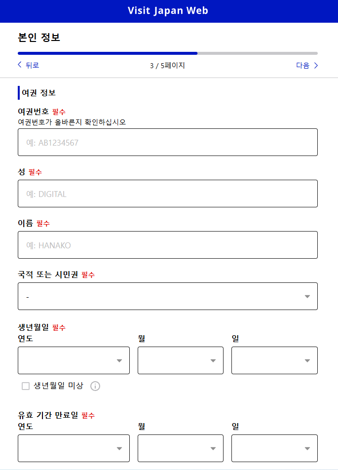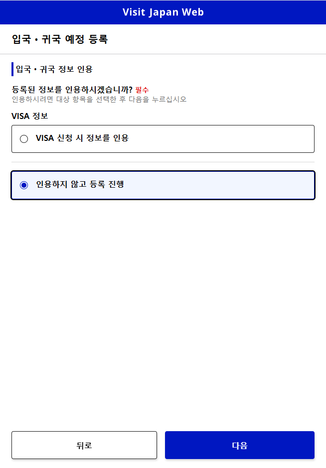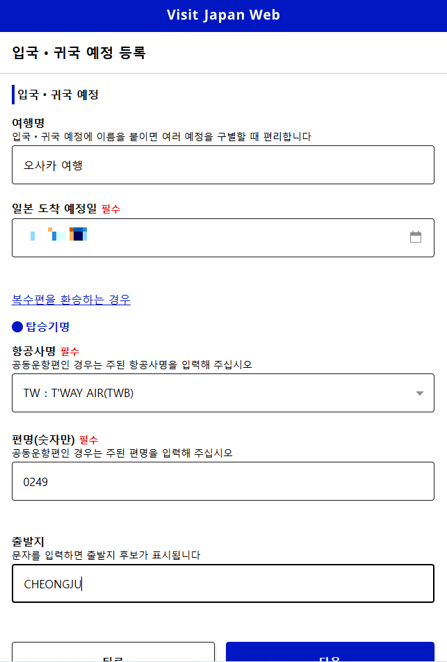 먼저 일본 입국 정보를 입력합니다.
