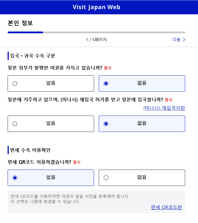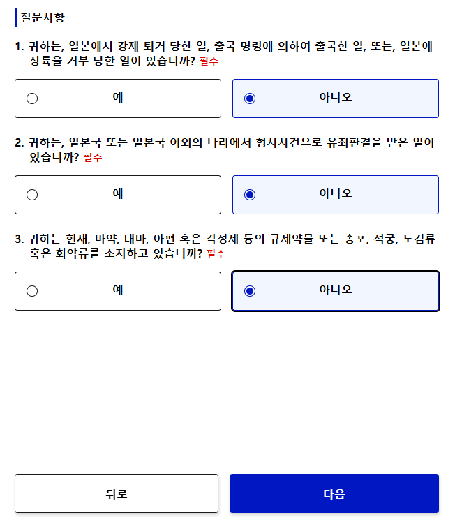 저는 일본 여권이 없고 일본 거주를 하고 있지 않아서 둘 다 없음을 선택했습니다.