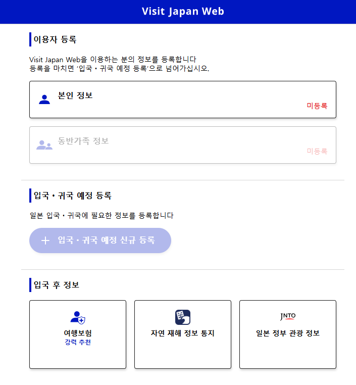 비짓재팬웹 입국, 귀국 예정 등록하기