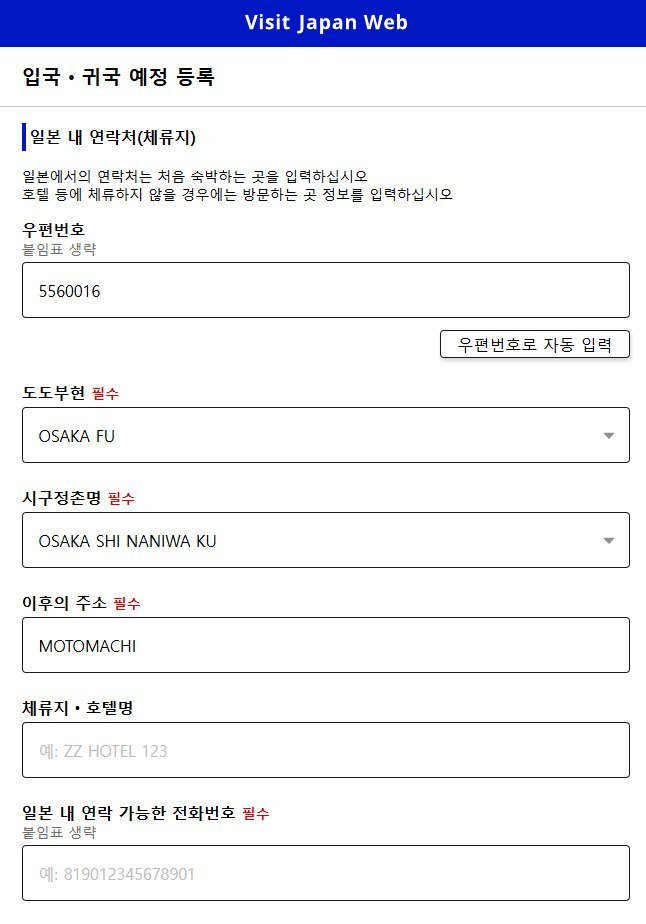 그다음 일본에서 묵을 숙소 정보를 입력해야 합니다.
