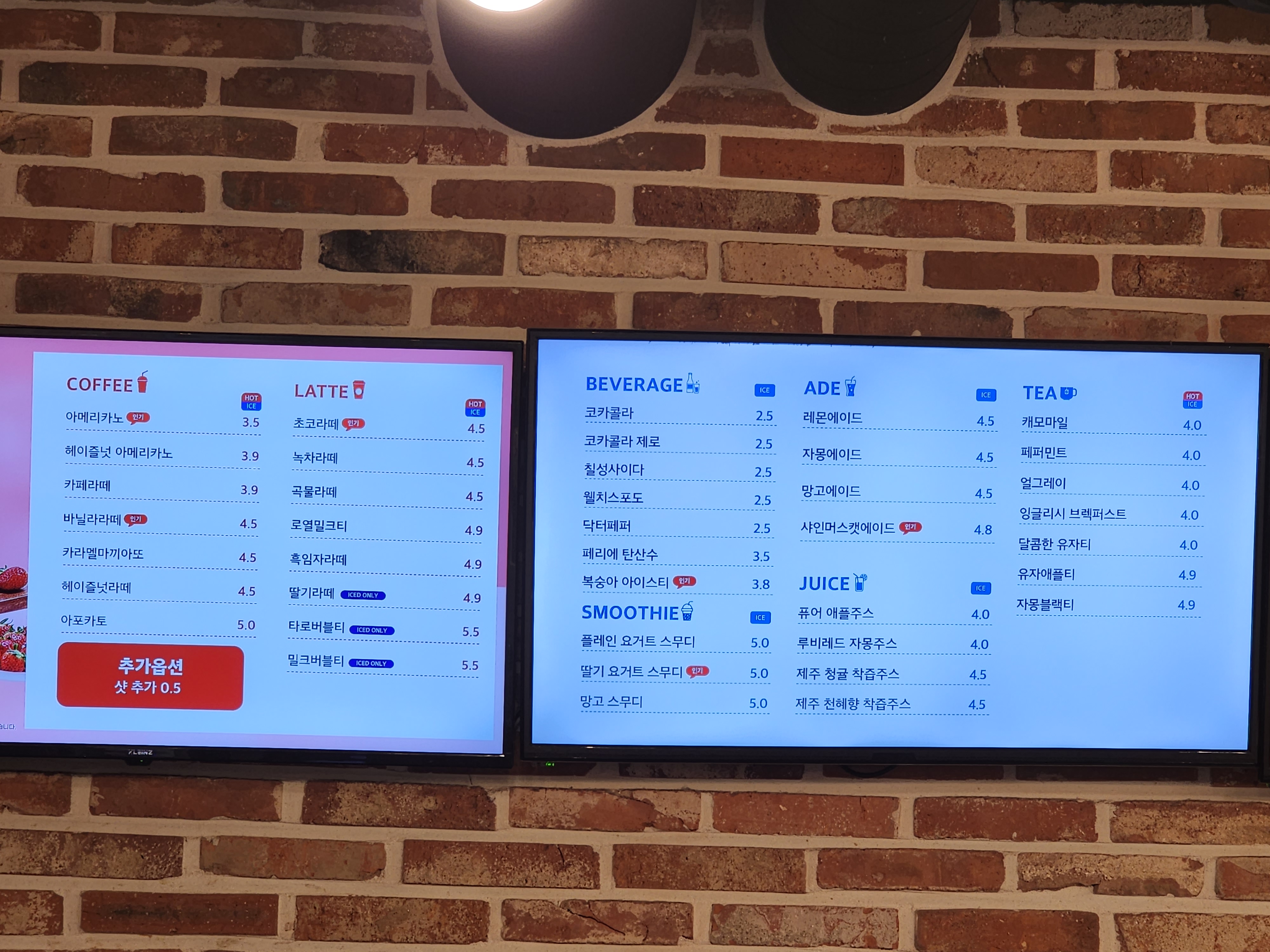 카운터 쪽에 한 눈에 보이는 메뉴판이 있어서 사진 찍었습니다.