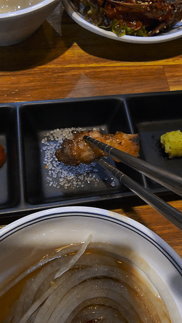소금에 찍어서 고기 맛을 더 잘 느낄 수 있었습니다.