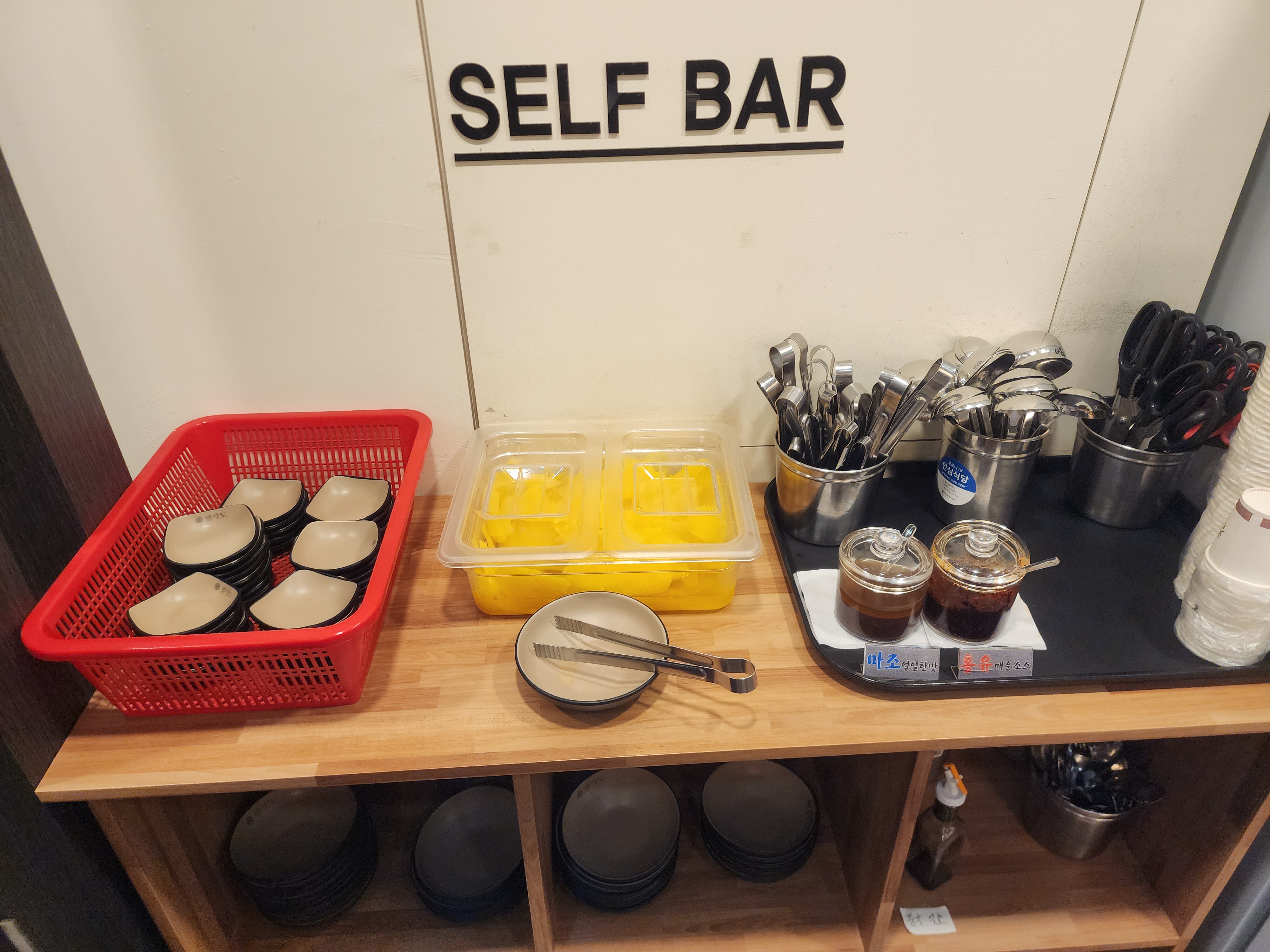 셀프바에서 앞접시와 단무지 등을 챙길 수 있습니다.