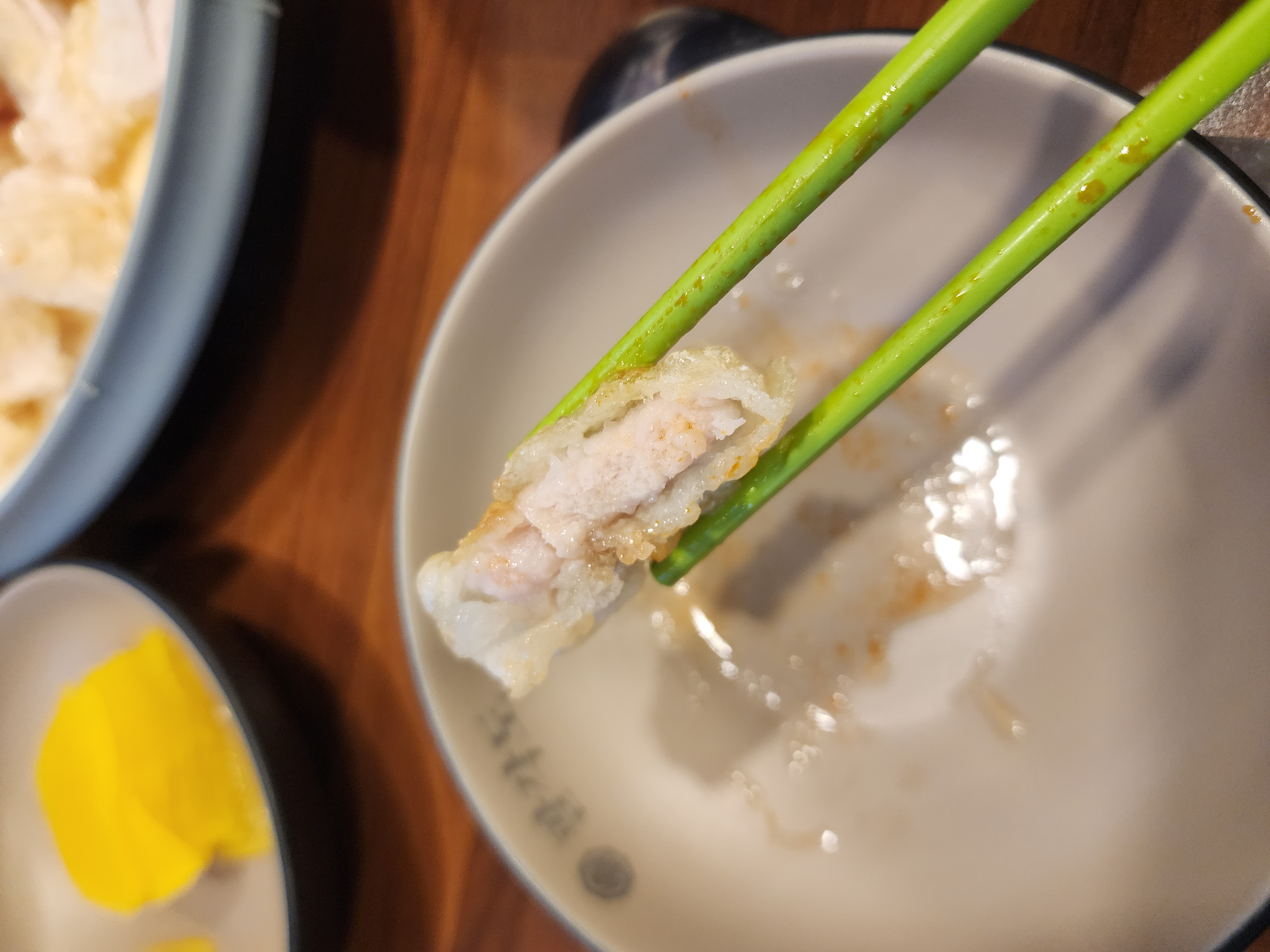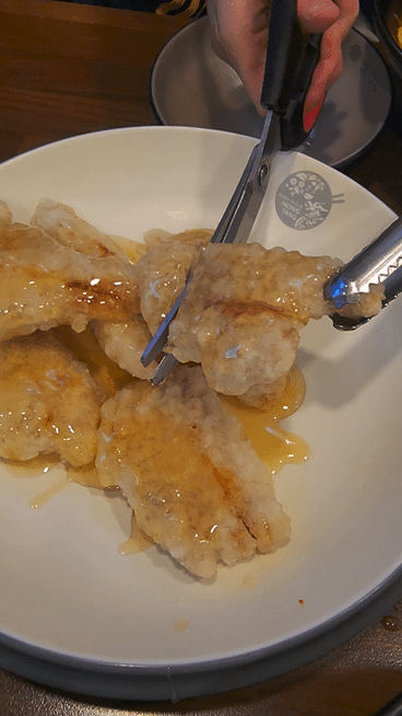 야무지게 자른 꿔바로우를 한 입 먹었습니다.