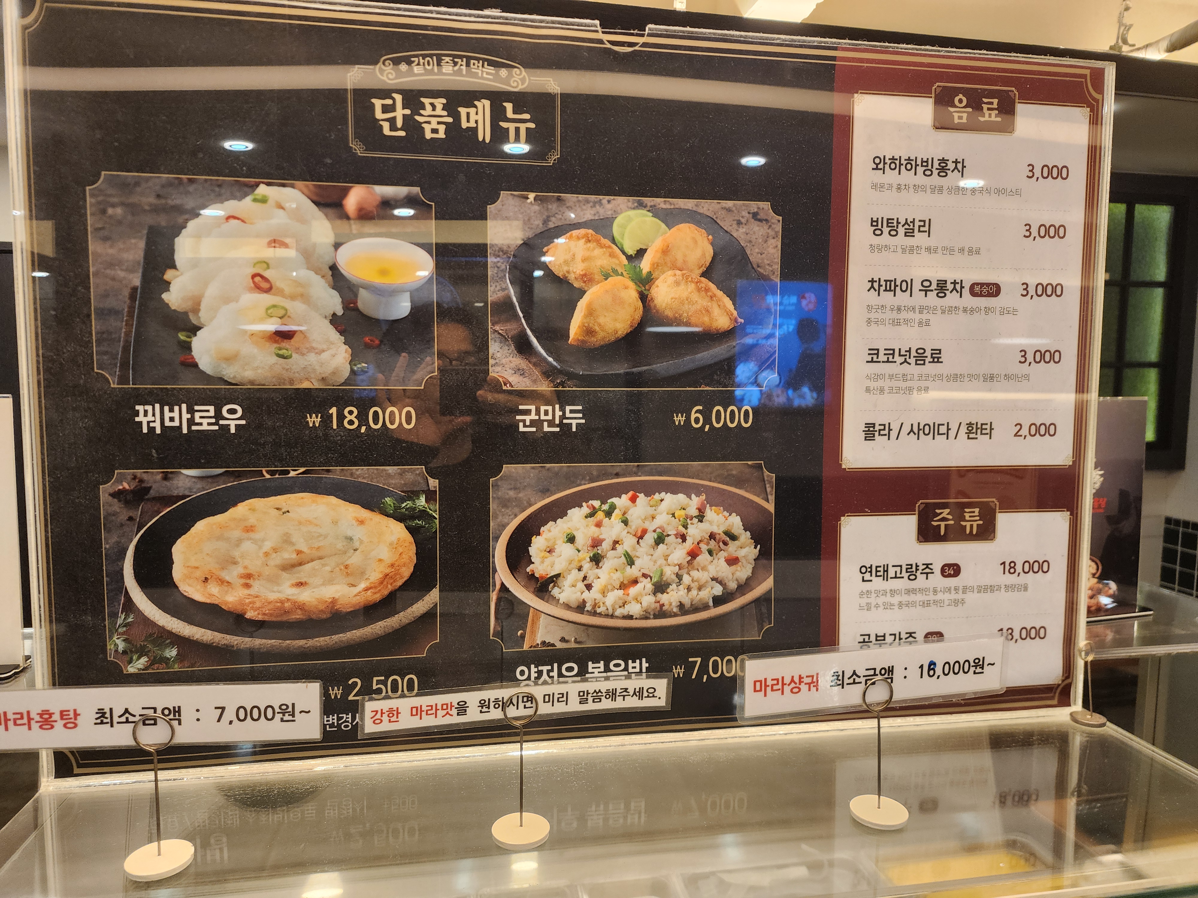 마라탕은 최소 금액 7,000원 이상부터 마라샹궈는 18,000원 이상부터 같습니다.