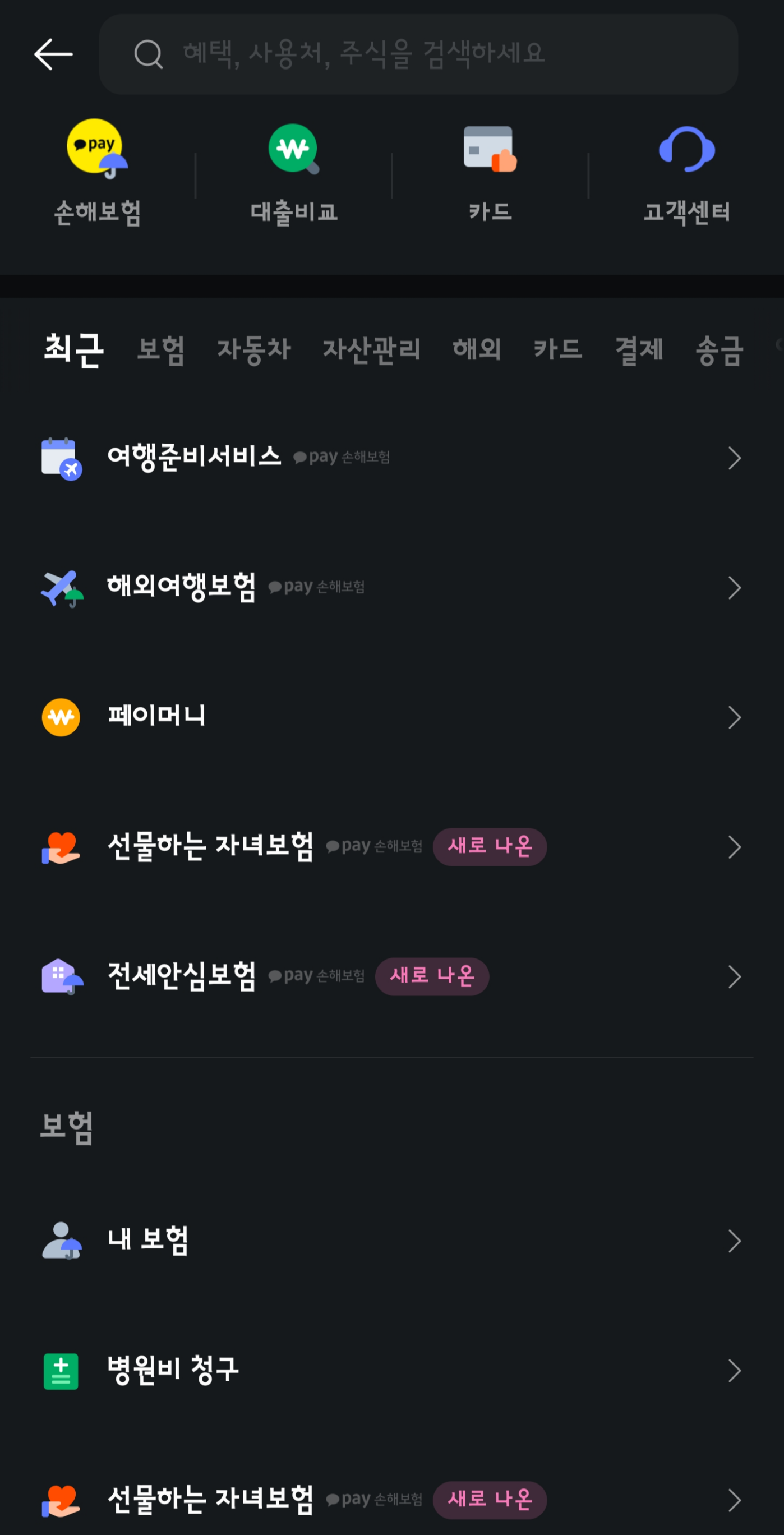 가입하는 방법은 카카오페이 어플에 들어가서 해외여행보험을 클릭합니다.