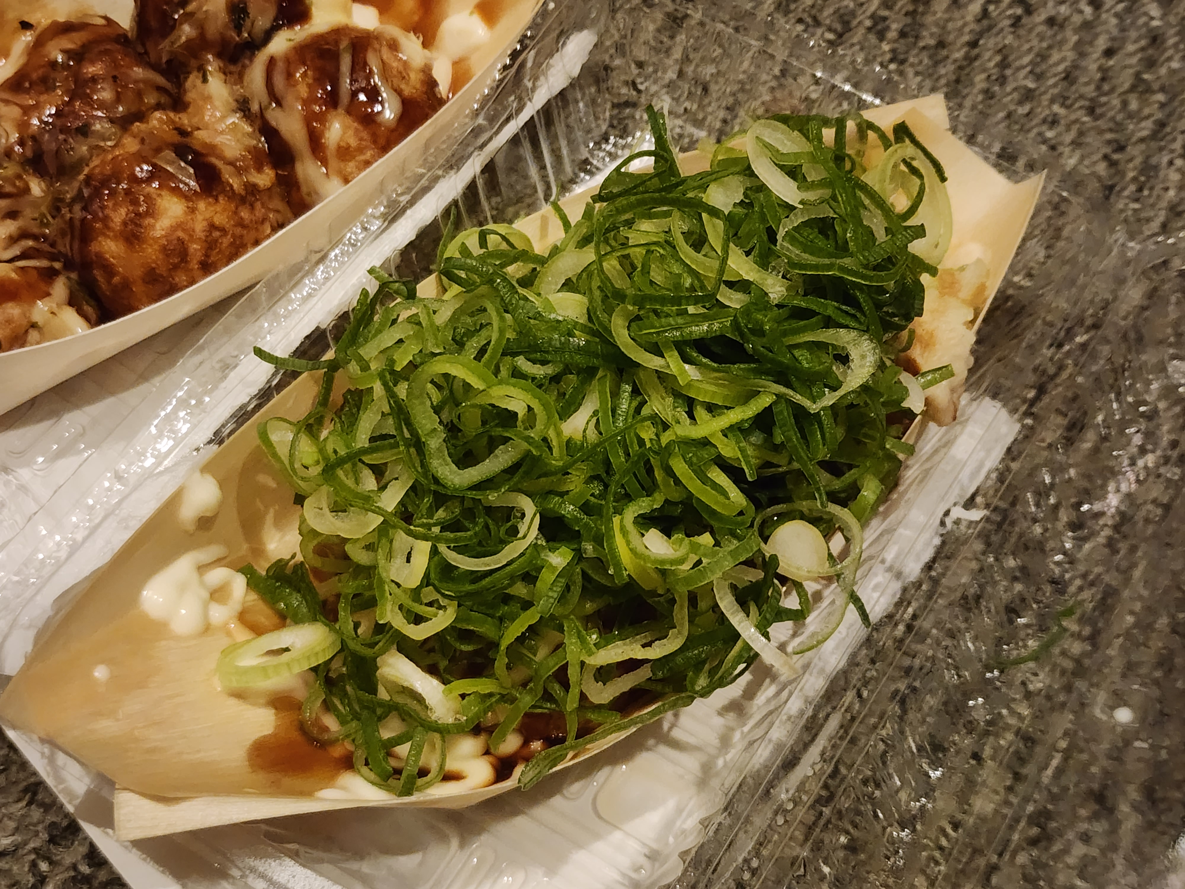 타코야끼에 올린 상태로 포장했으면 파의 숨이 죽었을 것 같은데 말이죠.