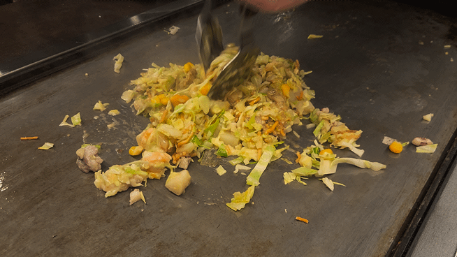 재료를 층층이 쌓아서 굽는 오코노미야끼와 다른 점이 명확하죠.
