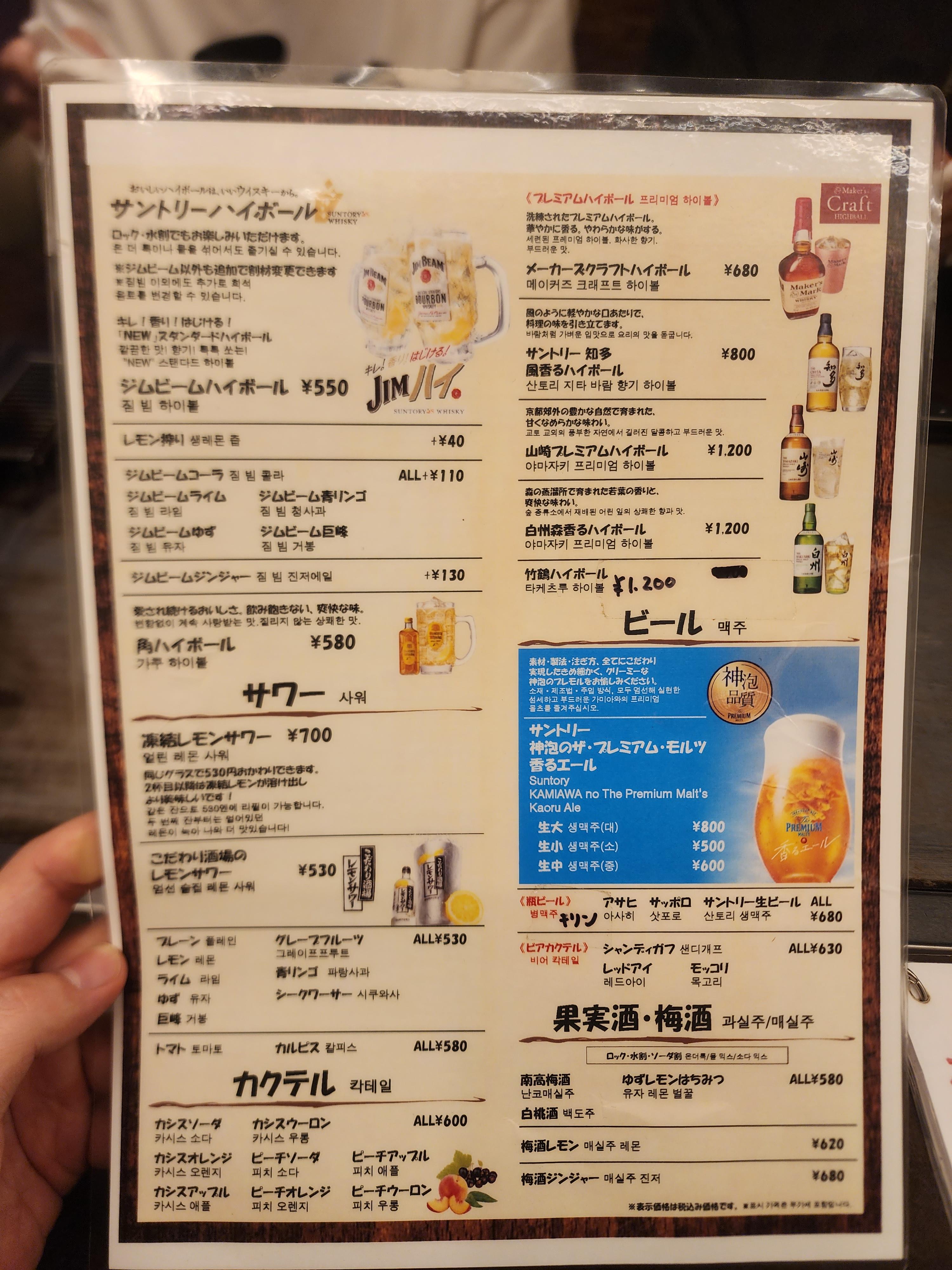 하이볼, 사와, 맥주, 사케 등등 취향에 따라 마실 수 있을 것 같습니다.