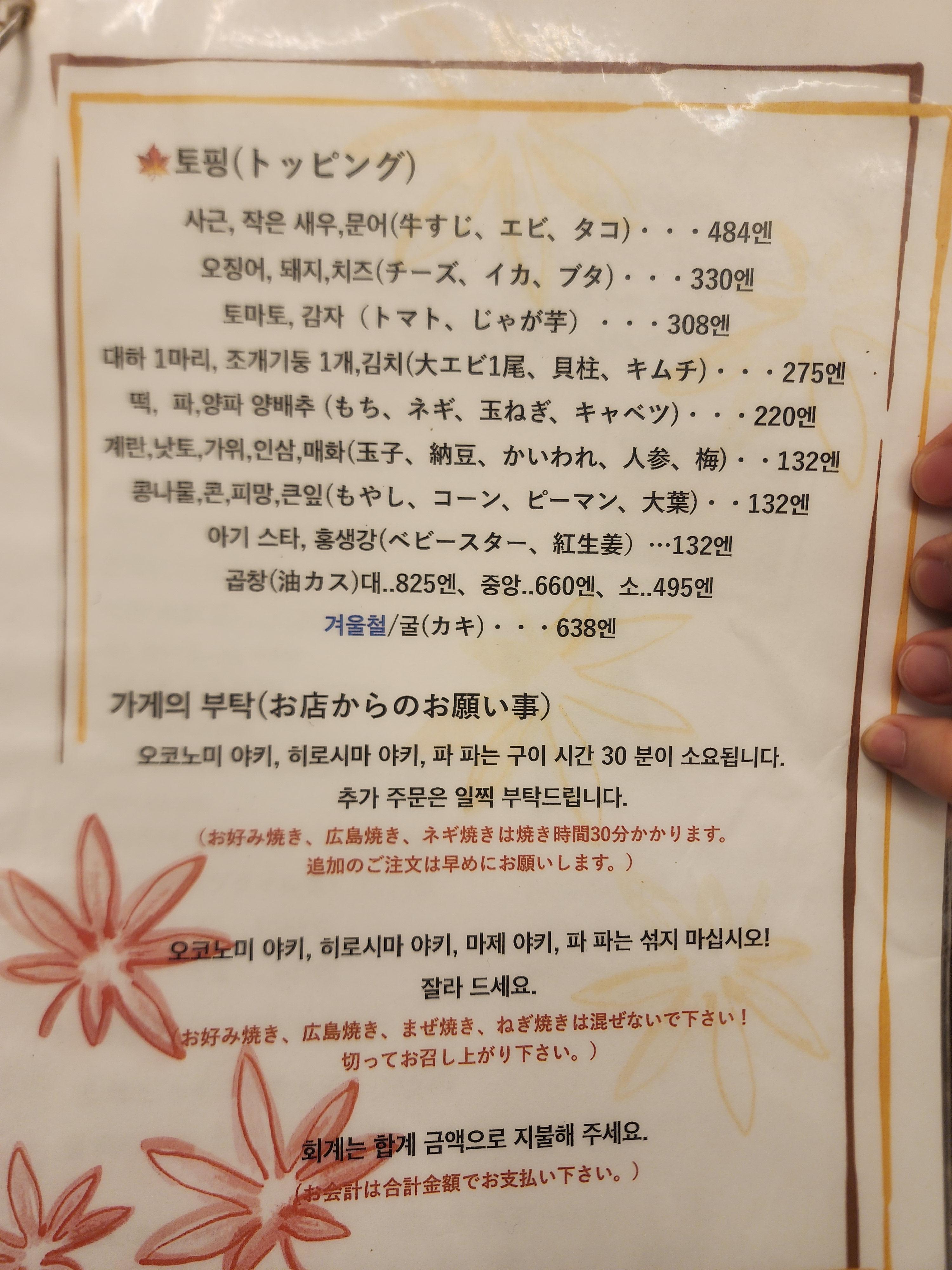 그렇다고 2층에서 오코노미야끼가 안 되는 것은 아니라서 메뉴 물어볼 시 빠르게 입장하고 싶다고 말하는 게 좋을 것 같습니다.