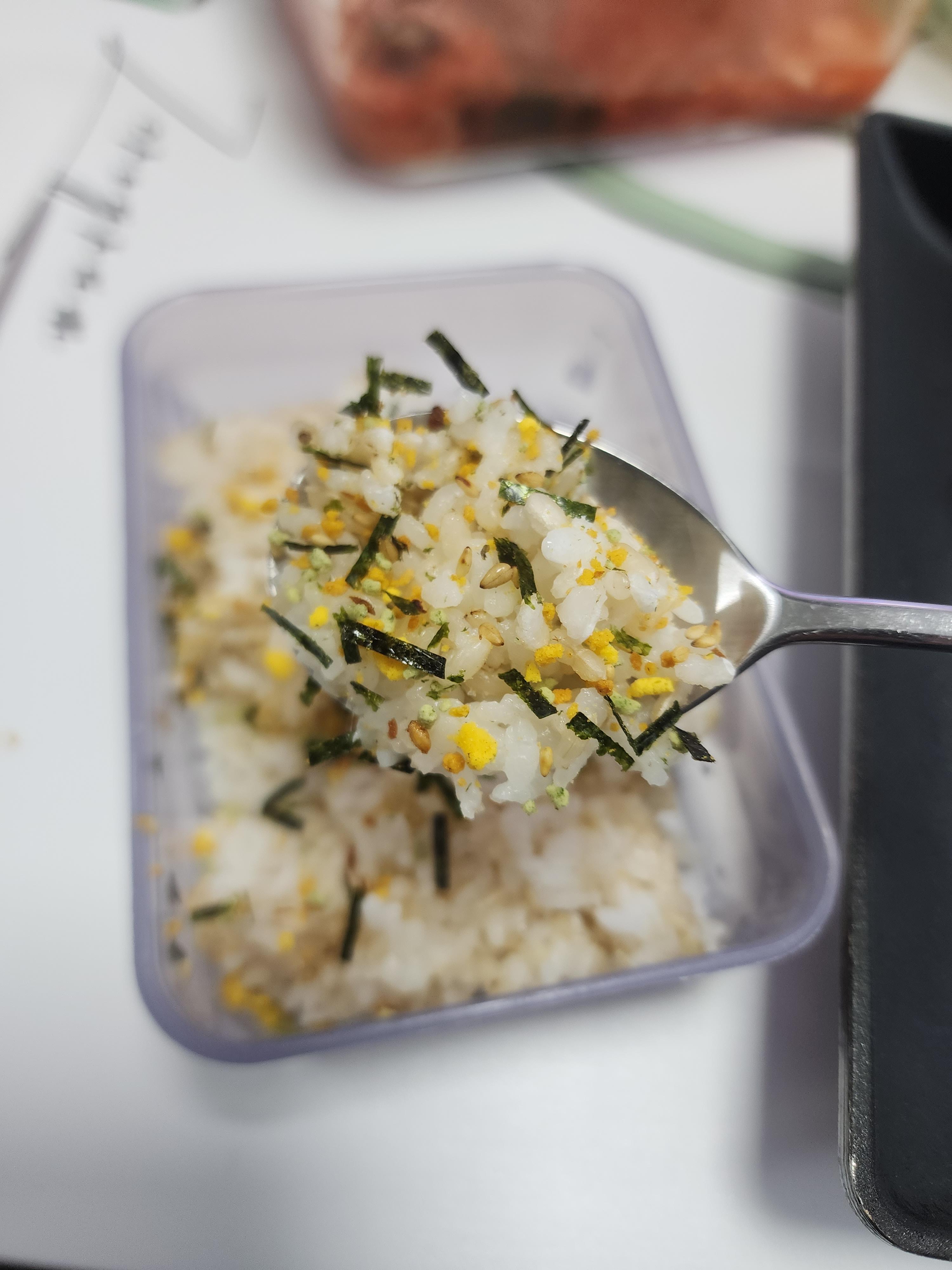 바로 먹던 밥 위에 후리가케를 찹찹 뿌려줍니다.
