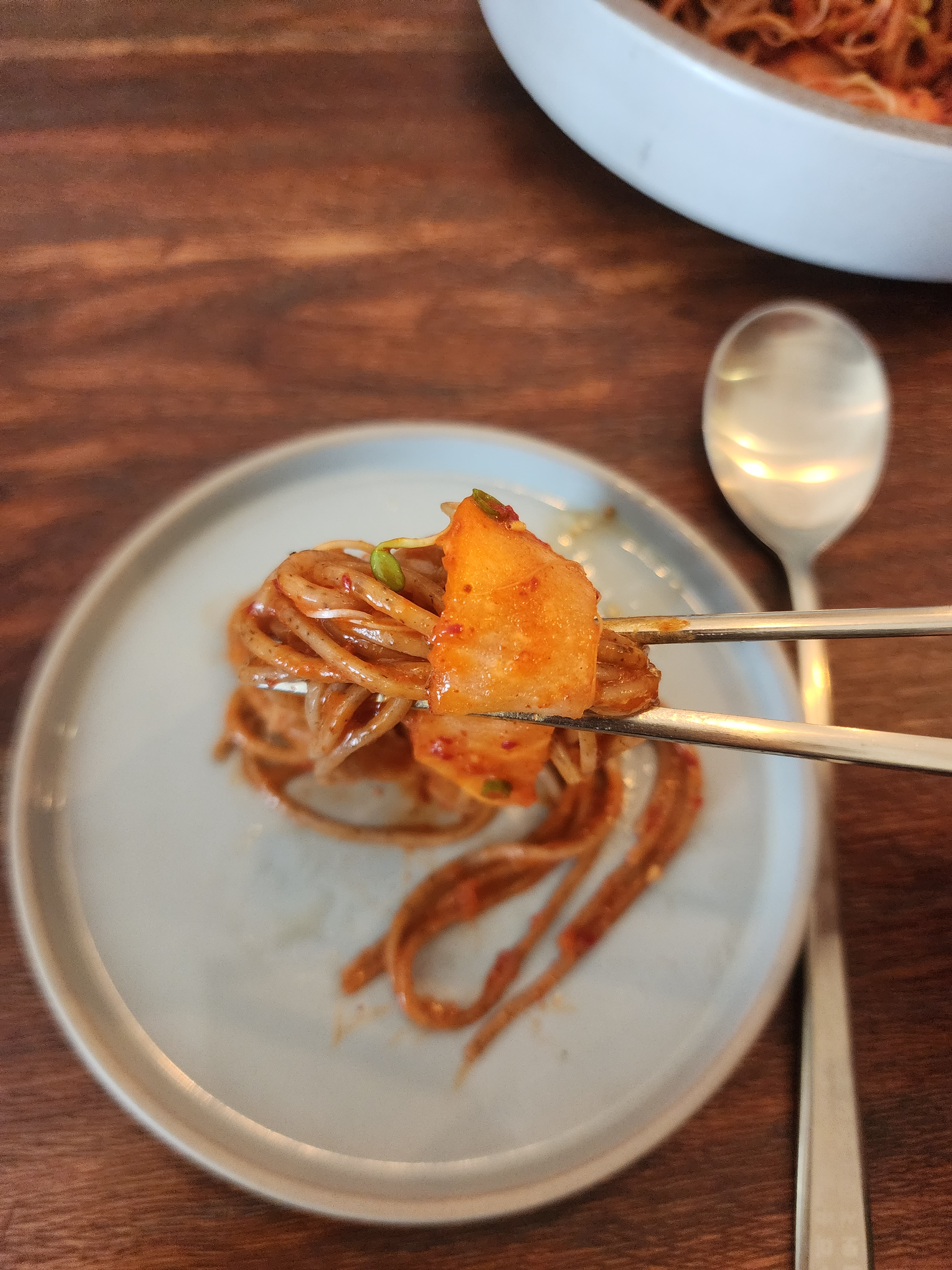 바로 비빔 막국수를 한 입 먹었습니다.