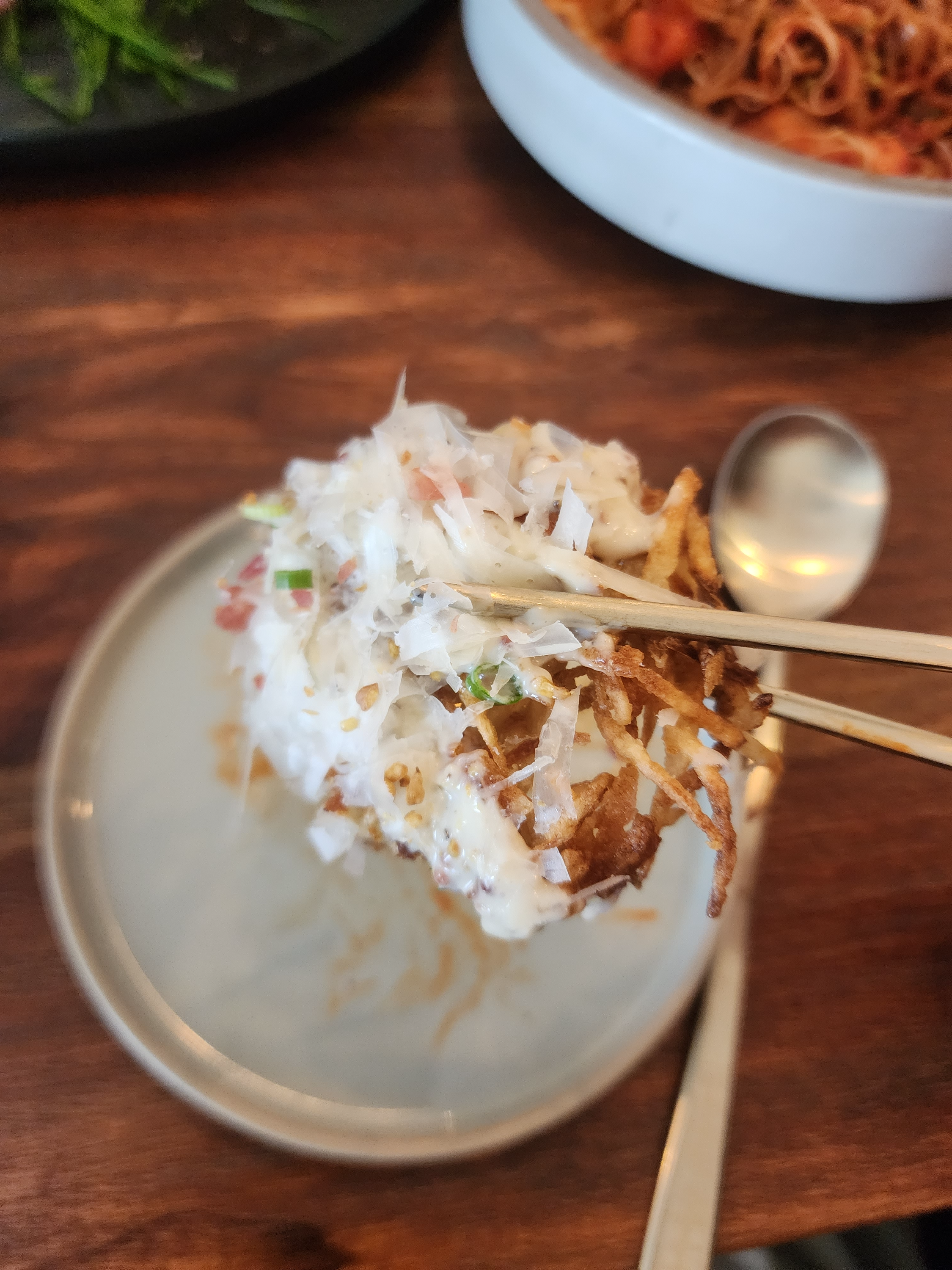 이쁘게 플레이팅 된 음식을 섞으려고 하니 마음이 아프지만 후다닥 섞었습니다.