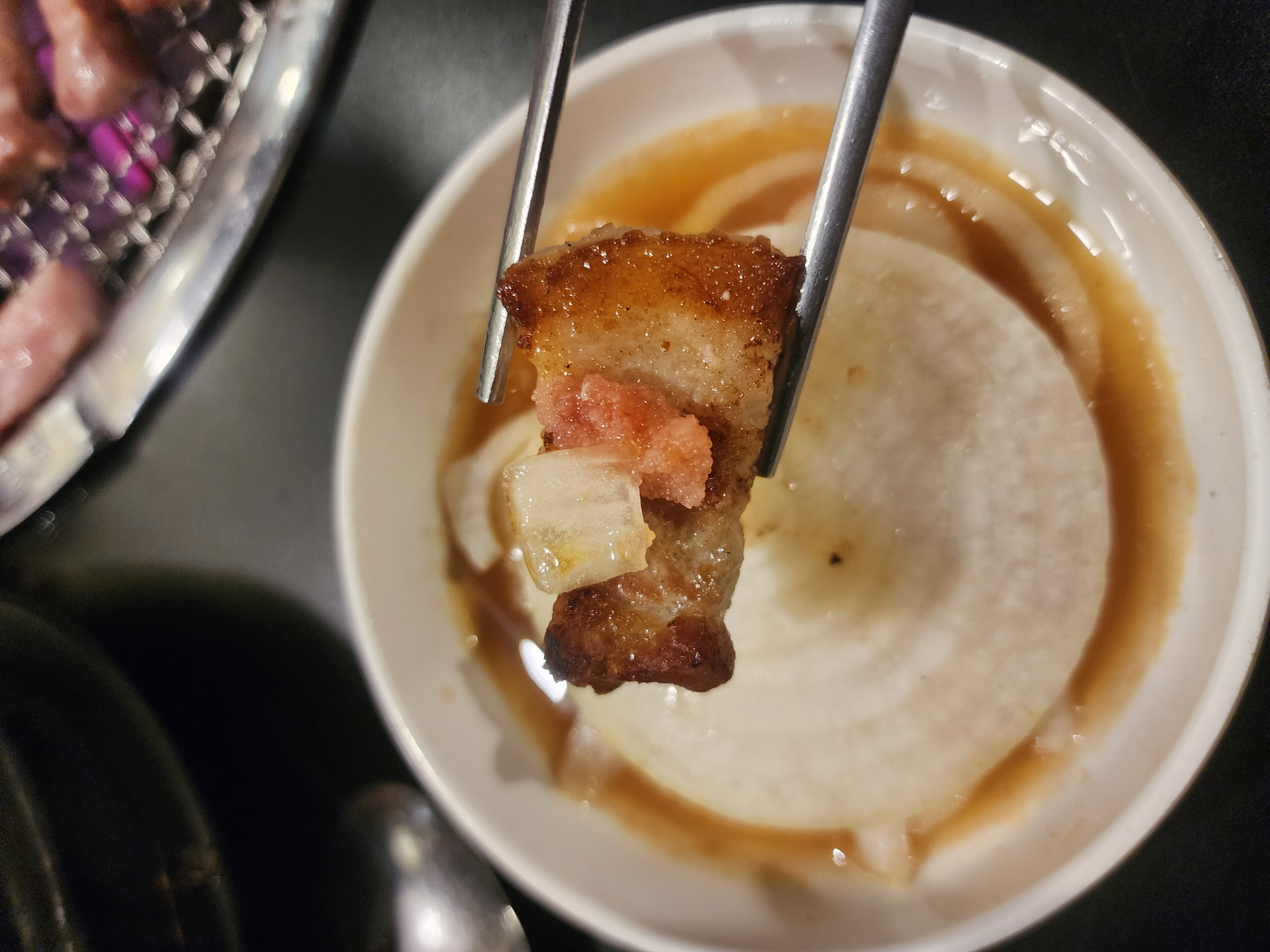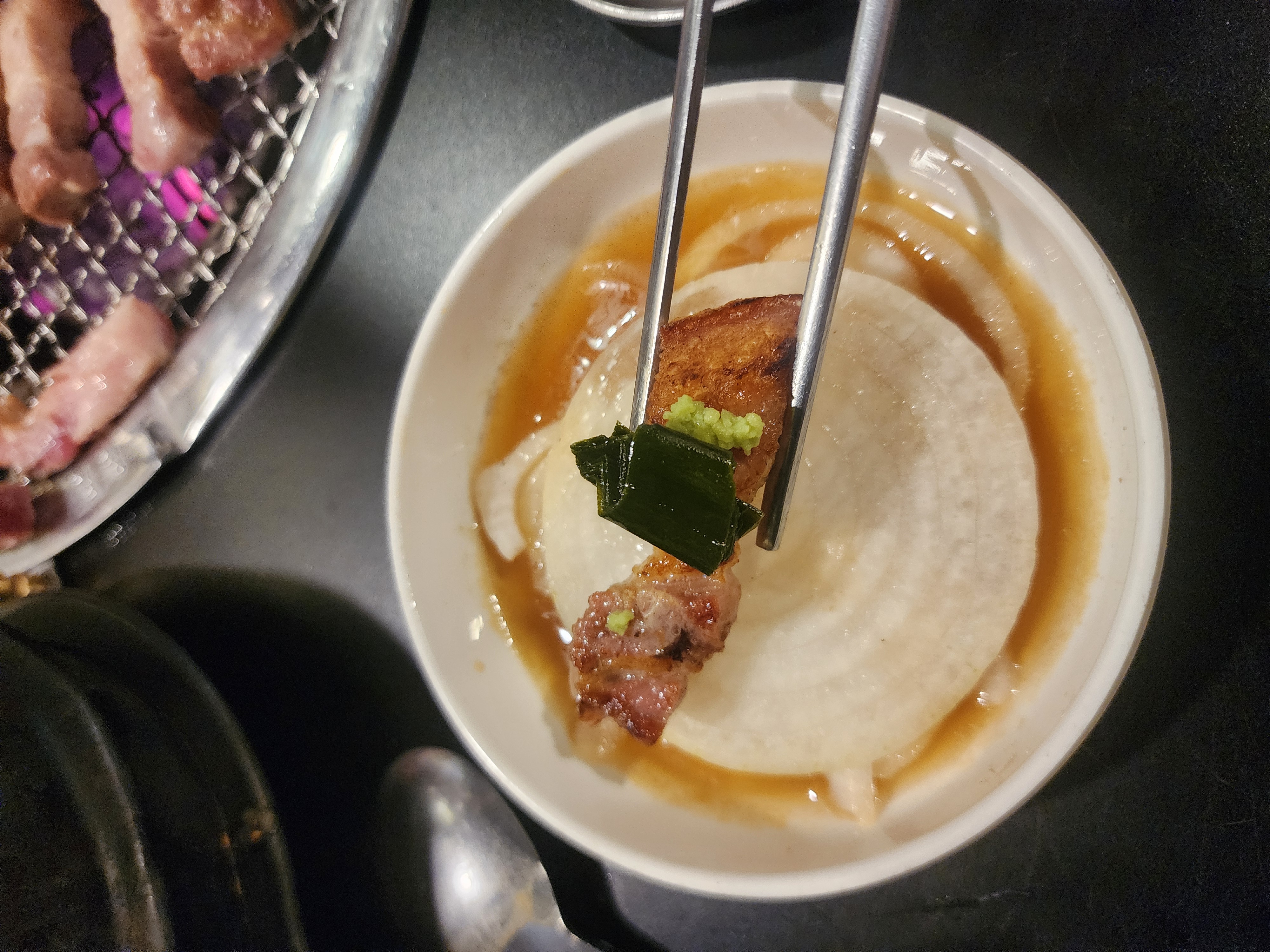 바로 먹어봤는데 명이나물의 상큼함과 와사비의 톡 쏘는 맛이 고기의 기름진 맛을 잡아줘서 너무 맛있습니다.