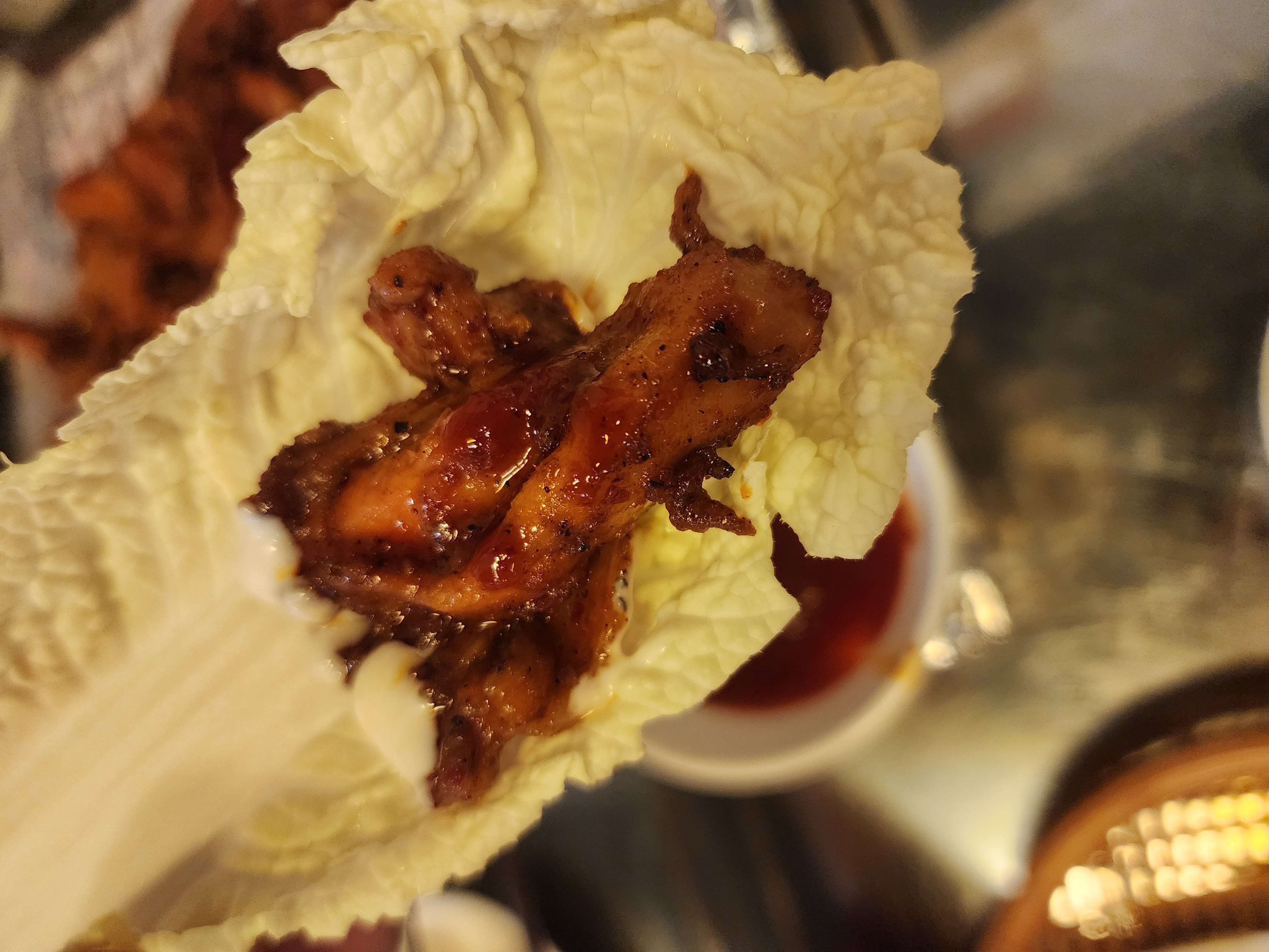 매콤한 소스에 닭다리살을 찍고 알배추쌈을 먹었습니다.