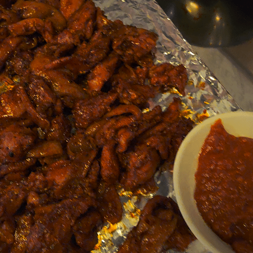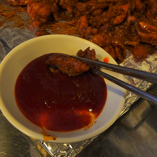 그다음 매콤한 소스를 찍어서 먹었는데요.