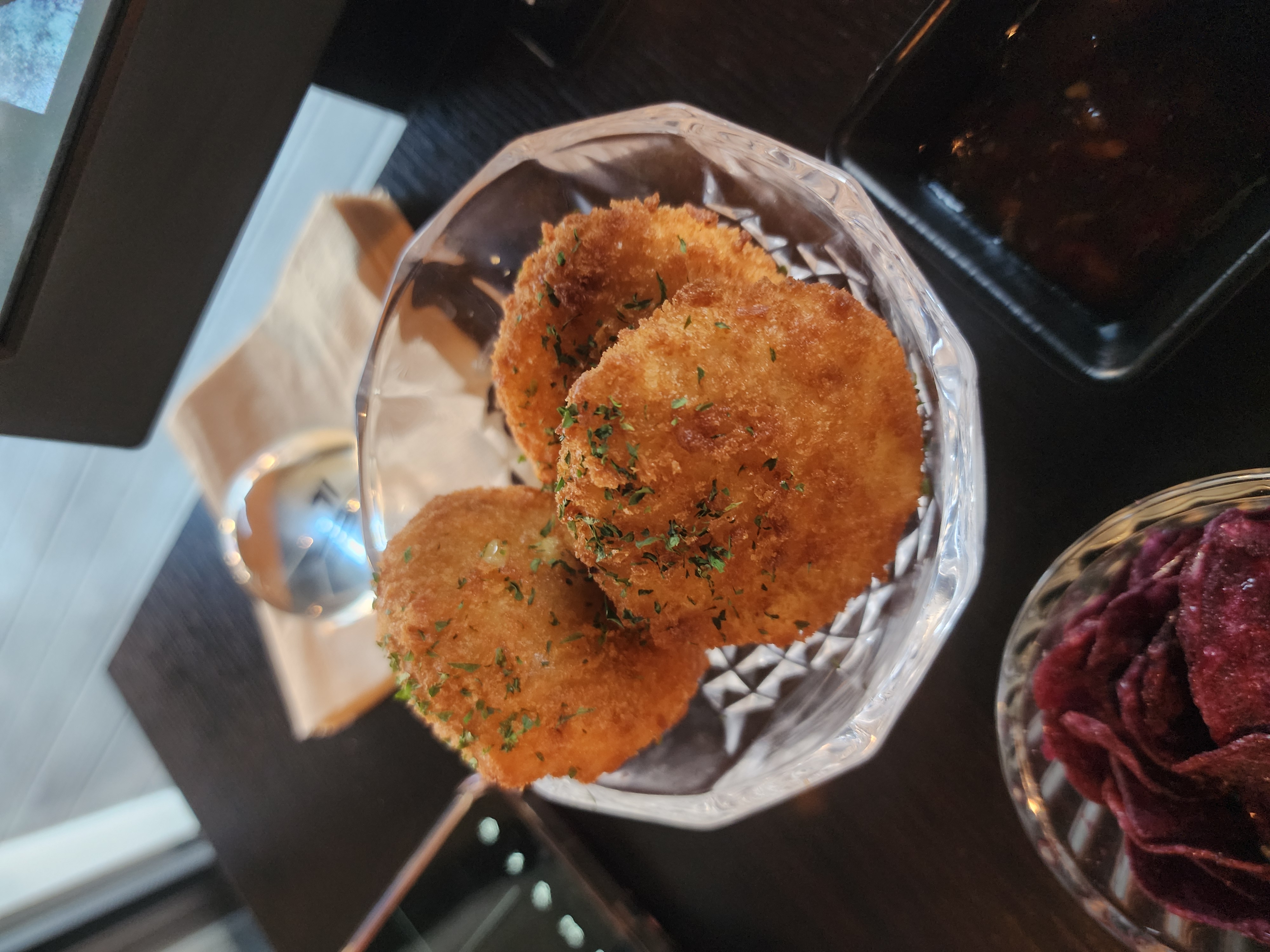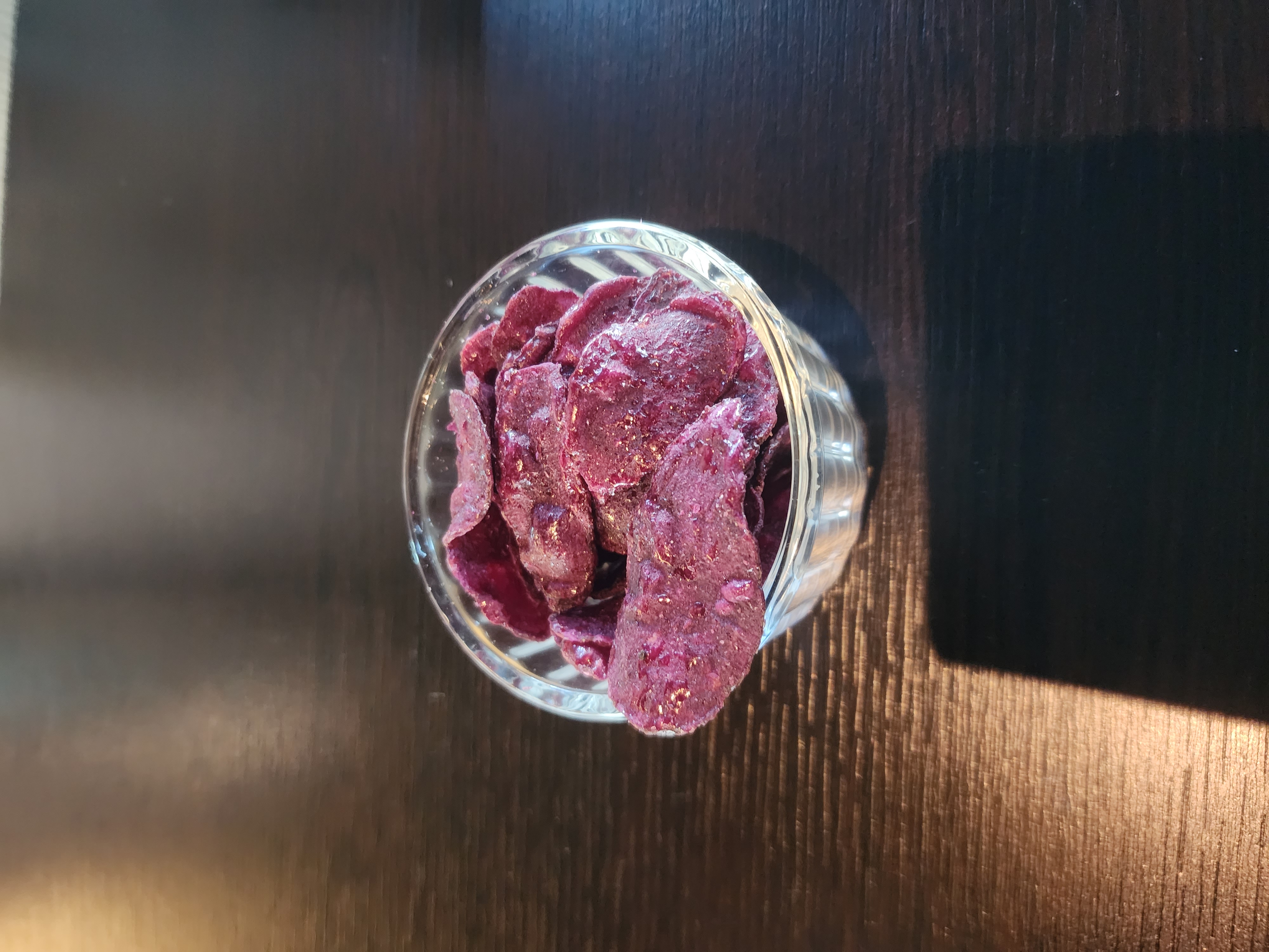 굄은 기본 안주로 자색 고구마 칩이 나옵니다.