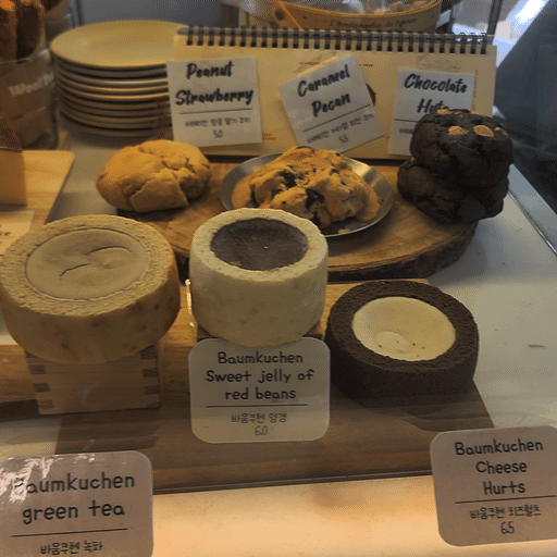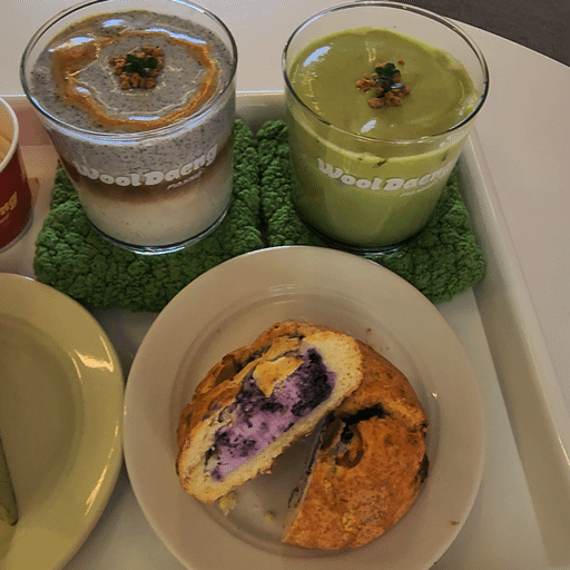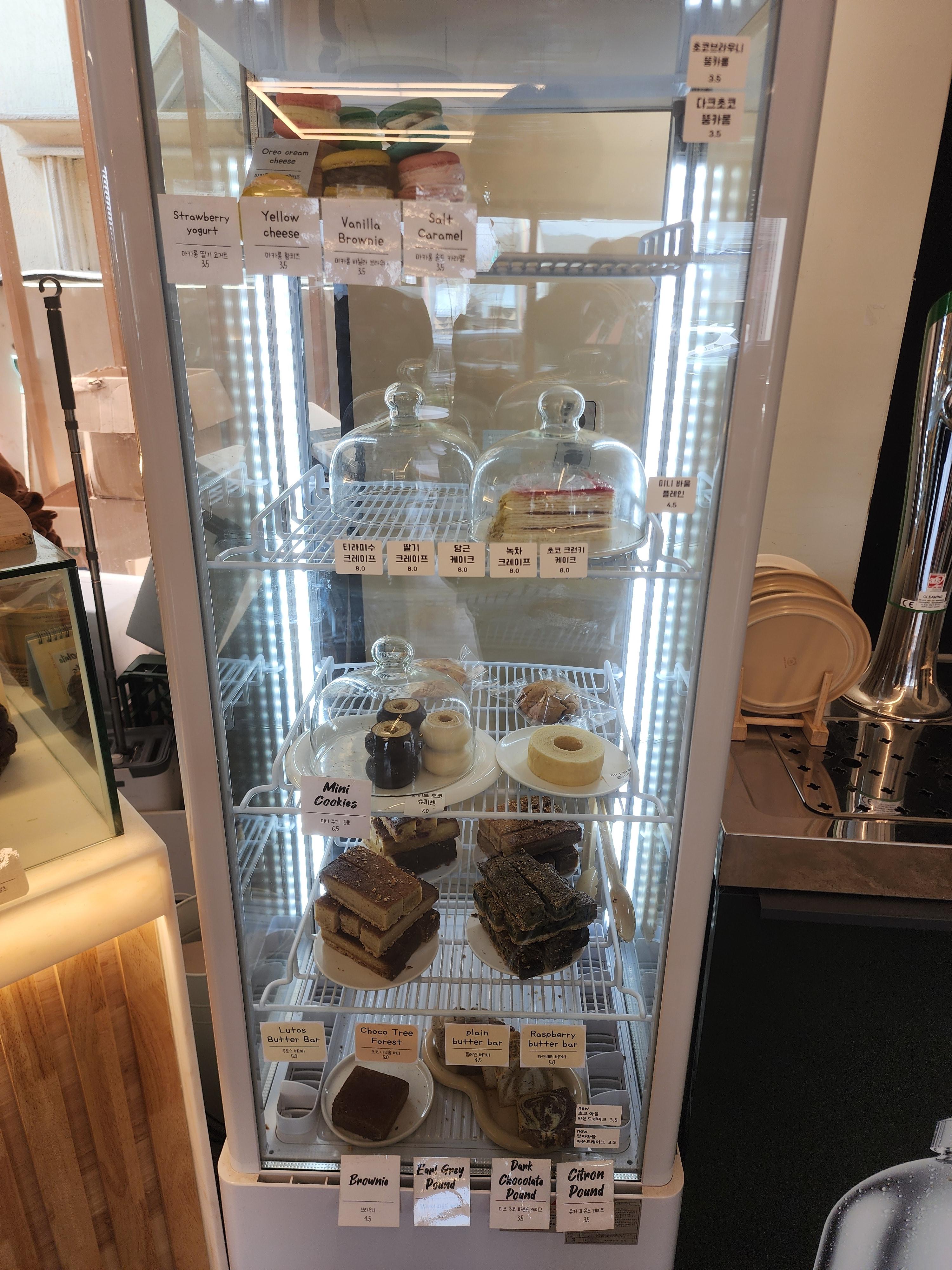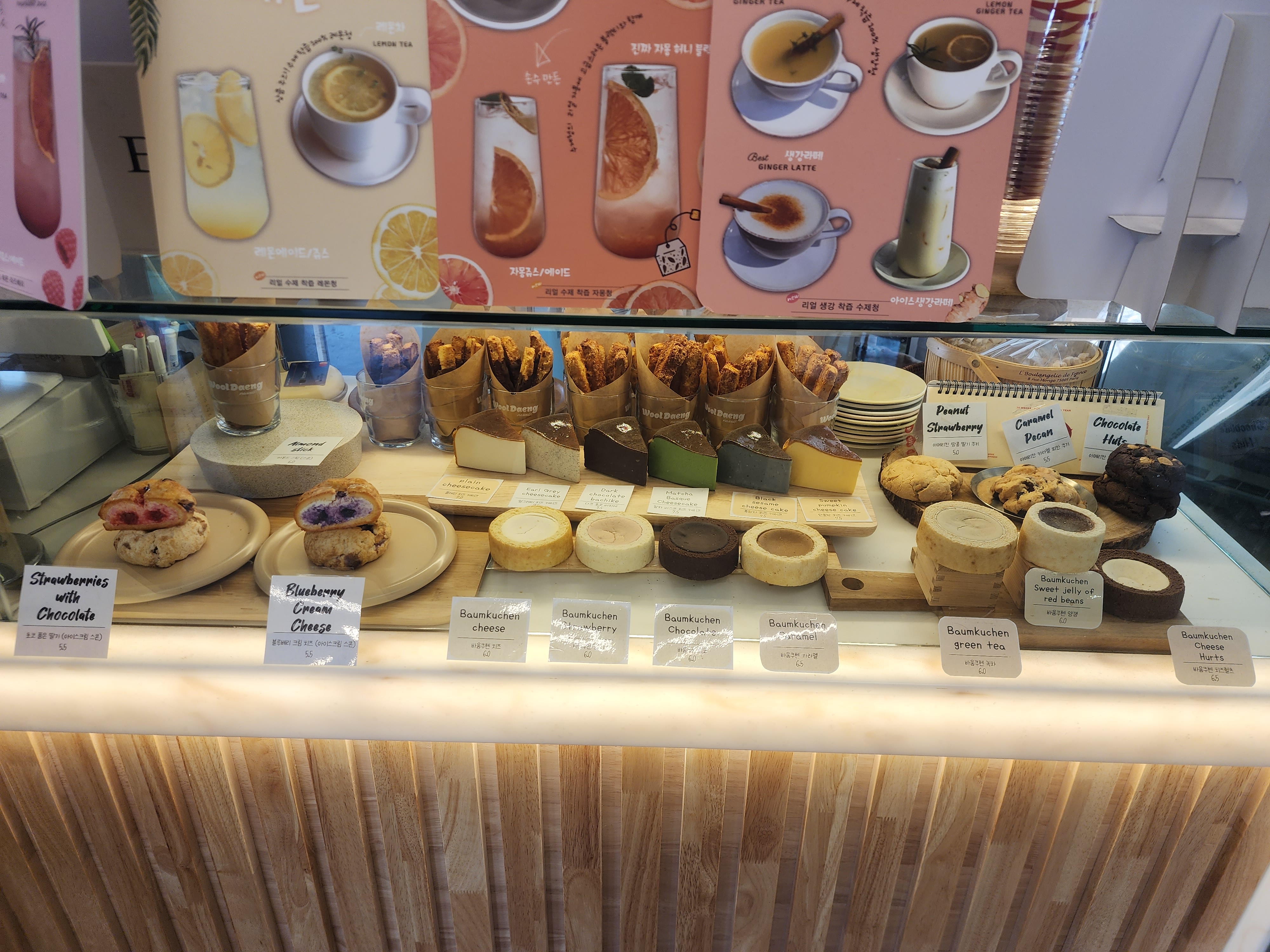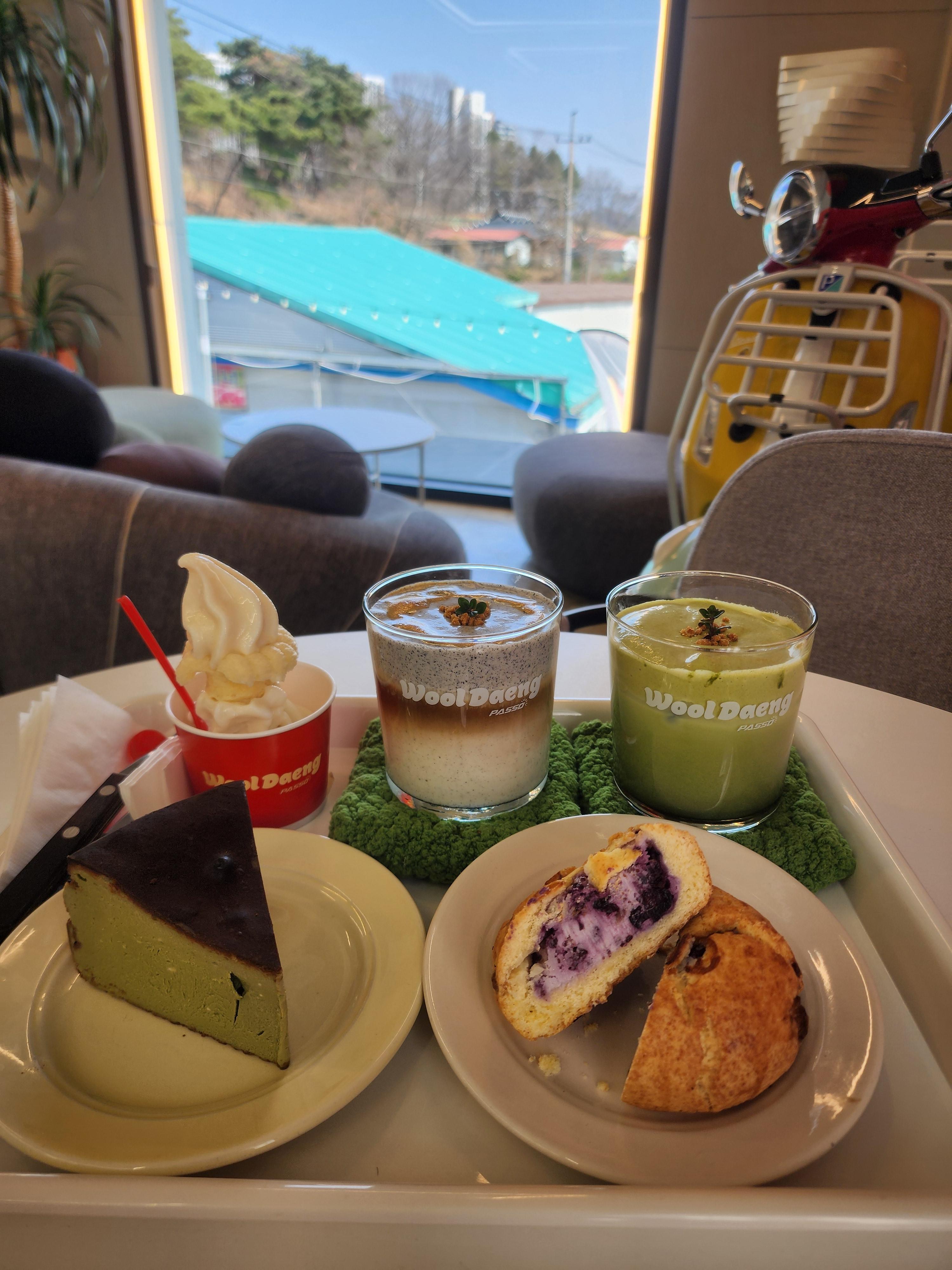 저희는 블루베리 크림치즈 스콘, 말차 바스크 치즈 케이크, 어니스트 밀크, 울댕커피, 잔디밭라떼를 주문했습니다.