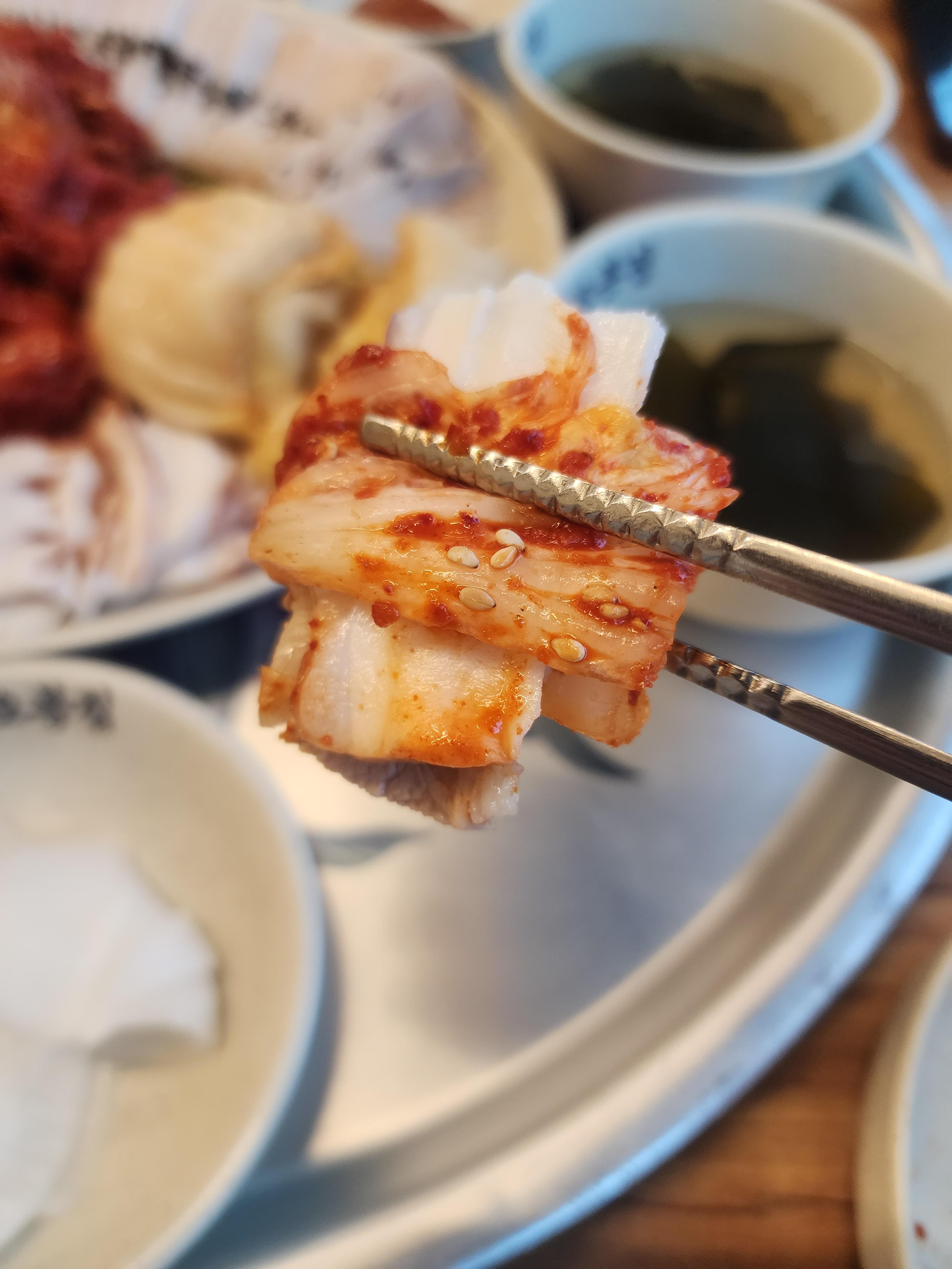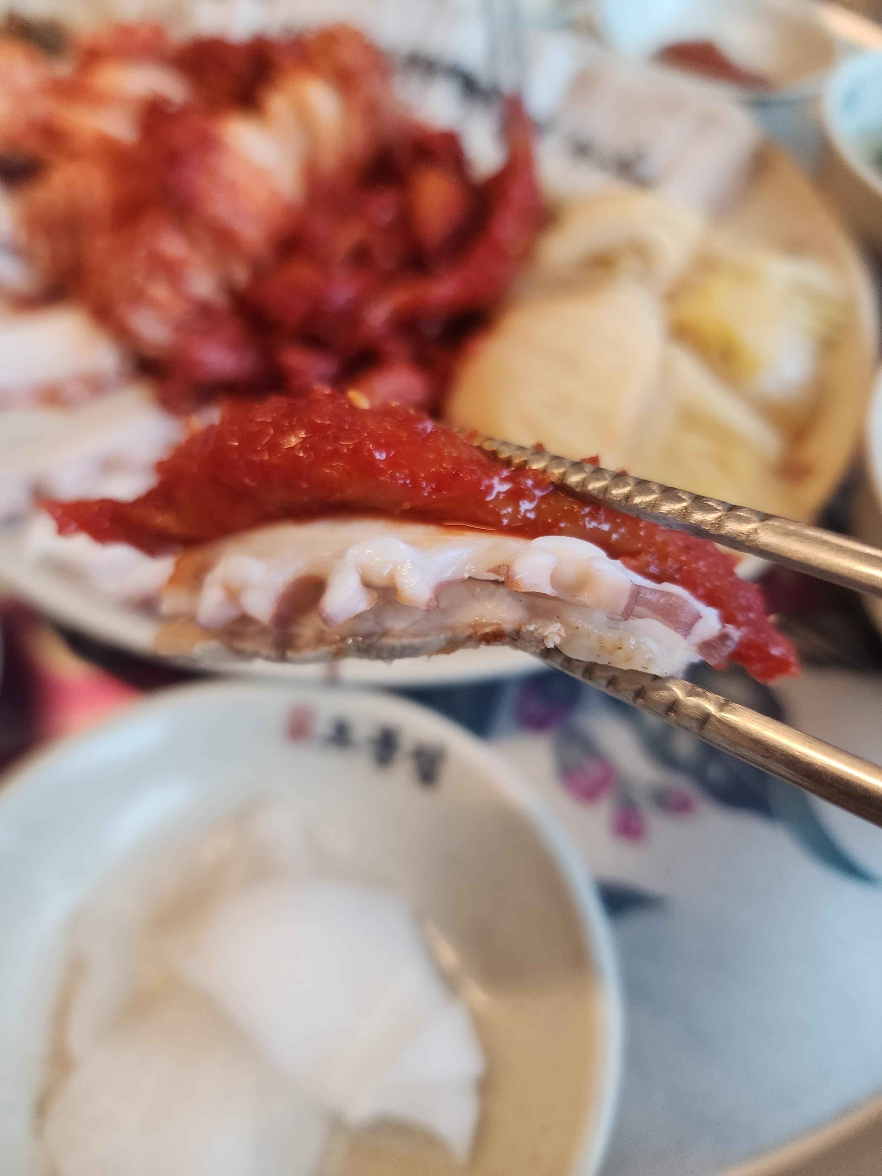 보쌈을 기본 조합인 배추김치와 문어를 함께 먹어봤습니다.